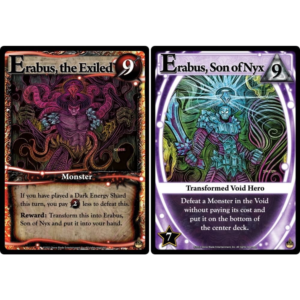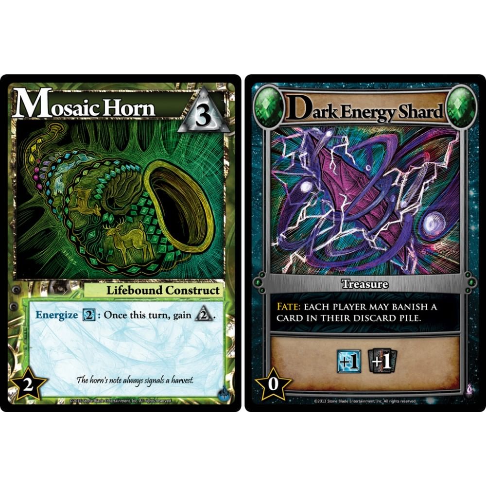 - 196 kariet: 2x štartovací balíček (každý obsahuje 8x Apprentices, 2x Militias a 1x Energy Shard), 33 "vždy dostupných" kariet (1x Cultist, 16x Mystics, 16x Heavy Infantry), 65 kariet "centrálneho" balíčka (13 obojstranných kariet premeny), 50 kariet pokladov (40 energy shards, 10 dark energy shards), 26 jednostranných kariet premeny