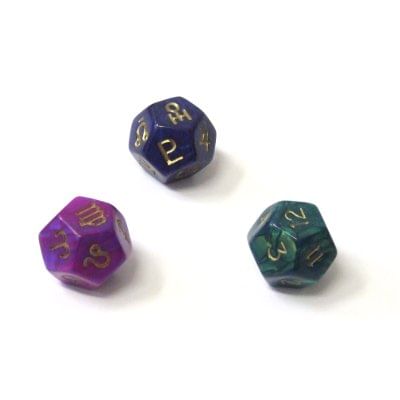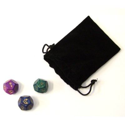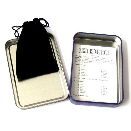 Súčasťou balenia je čierny plátenné vrecko na kocky, štýlová plechová krabička a anglický manuál s výkladmi jednotlivých symbolov. Kocky Vám môžu poslúžiť ako pomôcka pri štúdiu astrológia, pôsobivá dekorácia alebo len tak pre zábavu.