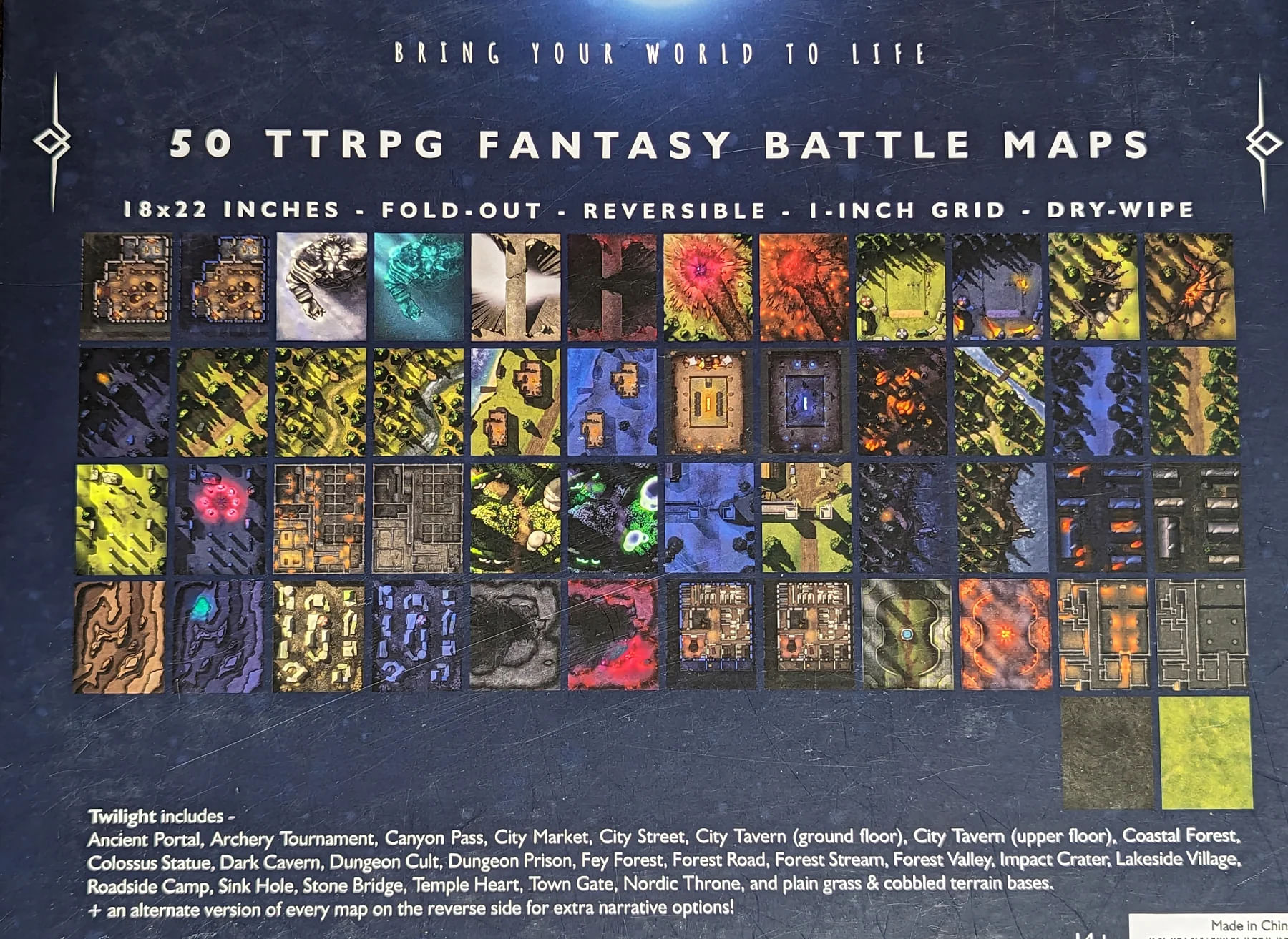 V balení nájdeš 25 obojstranných máp (celkom 50), ktoré len rozložíš a môžeš hrať. Každá mapa má úžasne detailné spracovanie, rozmer 45,7 x 55,9 cm, suchozmazateľný povrch a 2,5 cm mriežku, takže sa skvele hodí pre miniatúry aj rýchle poznámky priamo počas hry.