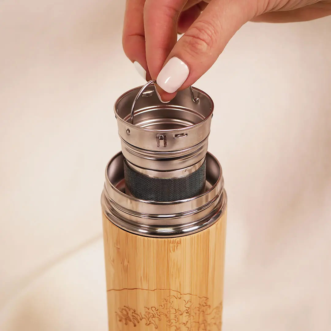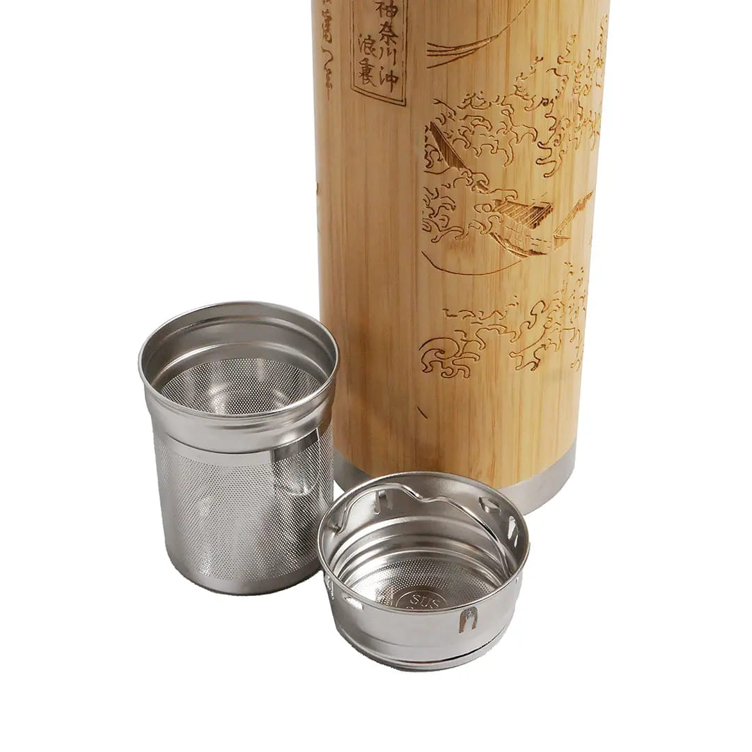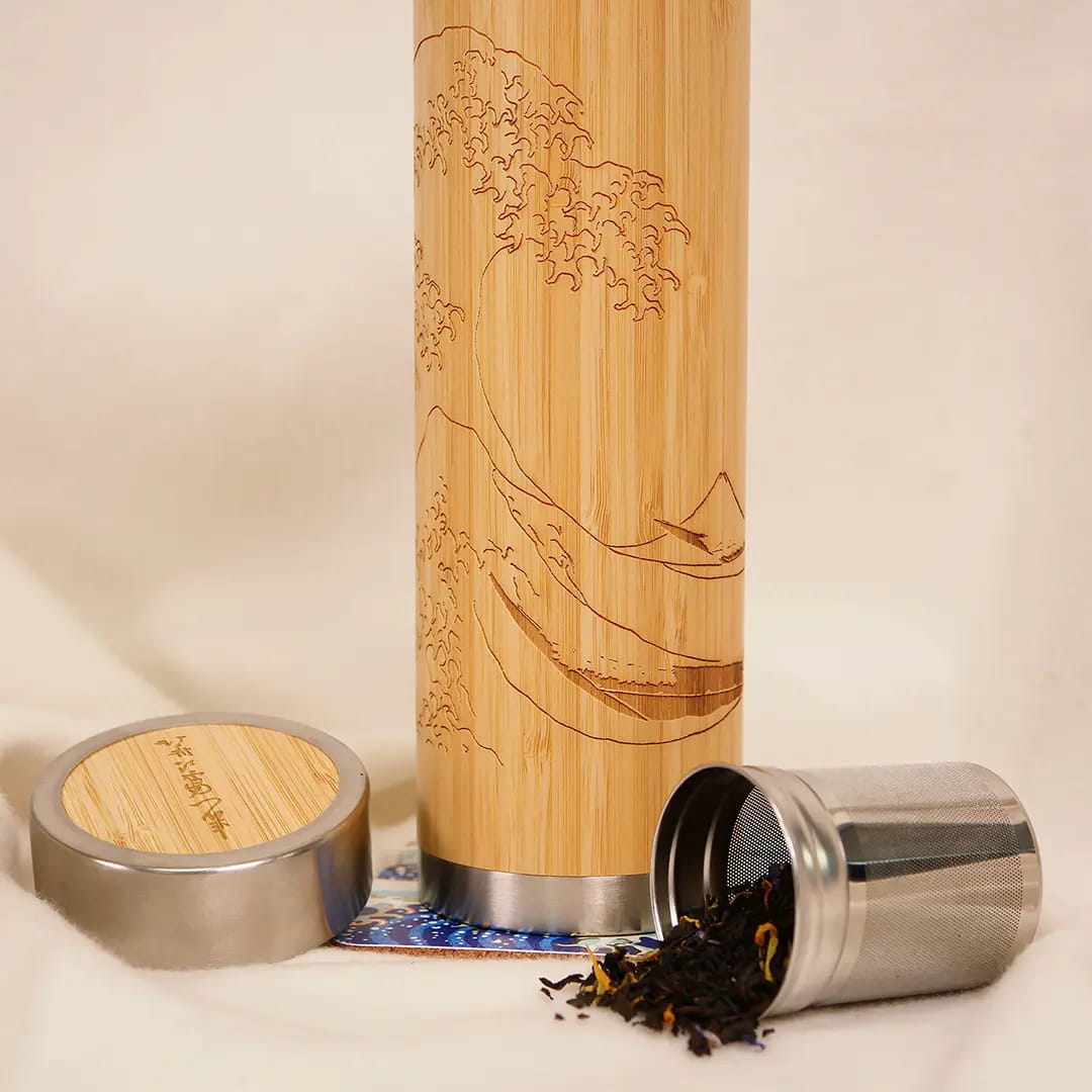 Táto bambusová termofľaša s motívom Veľké vlny pri Kanagawe spája prírodnú eleganciu a praktickú funkčnosť – ideálna pre čaj, kávu aj bylinkové zmesi.