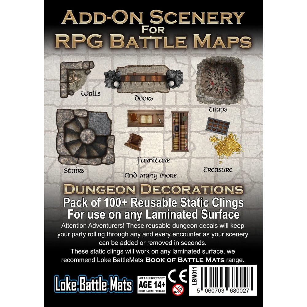 Sada obsahuje 5 hárkov s viac ako 1000 znovupoužitelnými samolepkami dverí, pascí, pokladov, vybavenie dungeonu a ďalších predmetov, ktoré sa hodia pre použitie v kombinácii s laminovanými hernými podložkami pre hry na hrdinov (RPG) od spoločnosti Loke BattleMats.