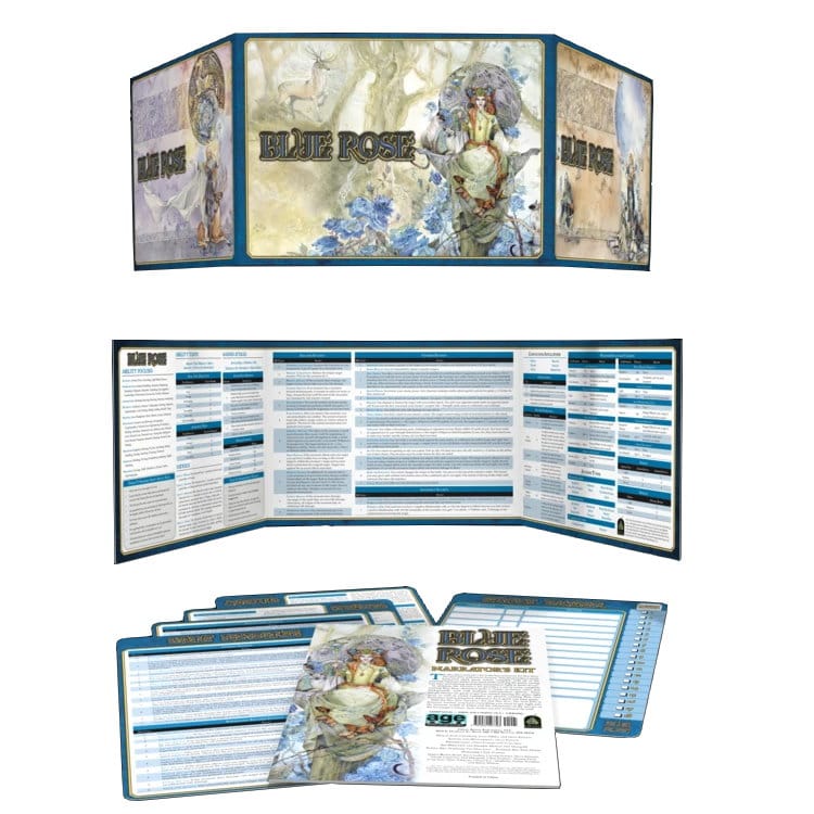 Blue Rose Moderátor 's Kit (AGE System) obsahuje zástenu pre GM, ktorá pozostáva z troch panelov, ďalej brožúru (16 strán) a 5 referenčných kariet pre romantickú fantasy hru na hrdinu Blue Rose: The aGE RPG of Romantic fantasy .