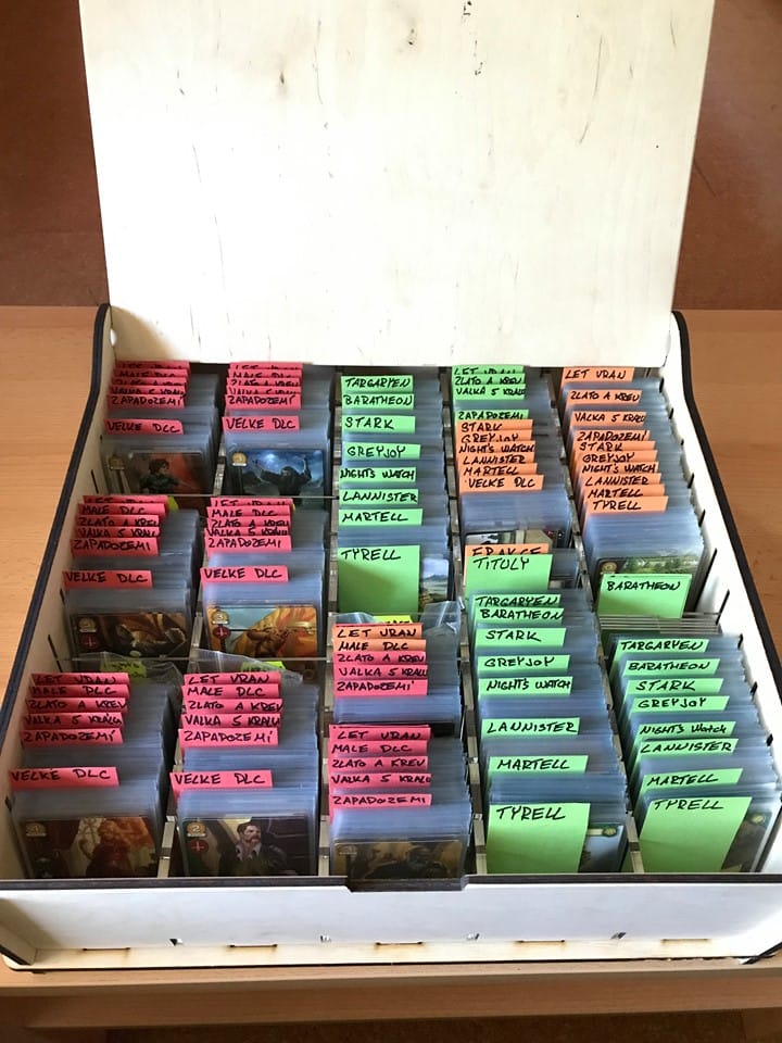 Je toto hodnotenie prínosné? ÁNO (3)Výborný box na karty, zakoupil jsem ho pro karetní hru Game of Thrones a skvěle plní moje požadavky v boxu na fotce je CCA 2500 karet (2x Corebox, 6 velkých rozšíření, 3 kompletní menší rozšíření) dalších 500-800 by se mělo vlézt bez problému, vnitřní přihrádky si můžete nastavit podle sebe, materiál ze kterého je box provedený je pevný a pěkný.