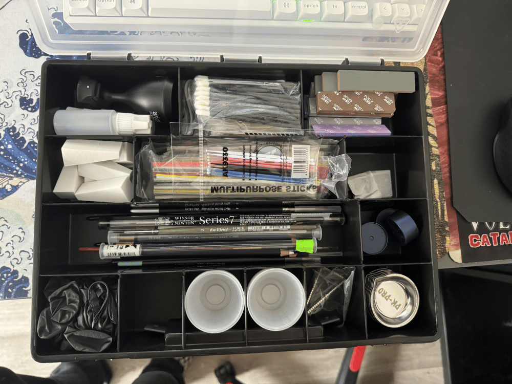 Praktický plastový zavíratelný box na malovací potřeby a příslušenství, na fotce už zabydlený, prodává se samozřejmě prázdný :c).