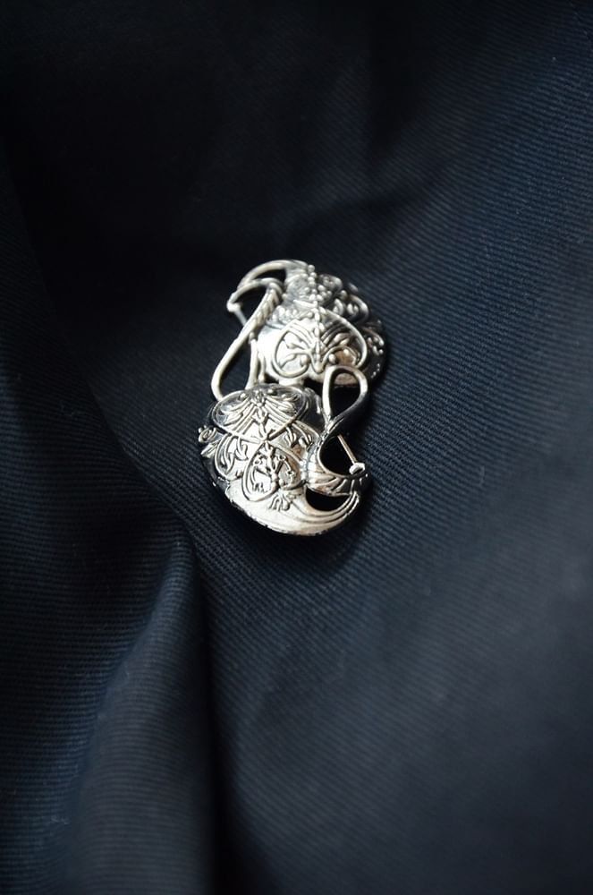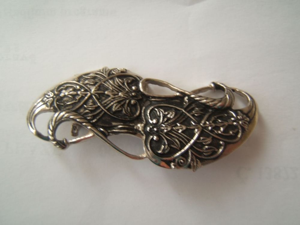 Decentné cínová brošňa, replika z filmu Pán Prsteňov. Je široká cca 6,5 cm, na zadnej strane je opatrená zapínacím špendlíkom.