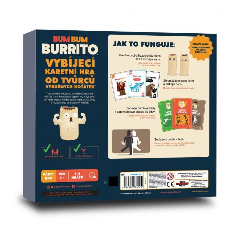 Bum Bum Burrito je párty hra, akú ste ešte nikdy nehrali. Bum Bum Burrito je kartová hra kombinovaná s vybíjanou, v ktorej hľadáte trojice kariet, zbierate body a hádžete burrito na ostatných hráčov!