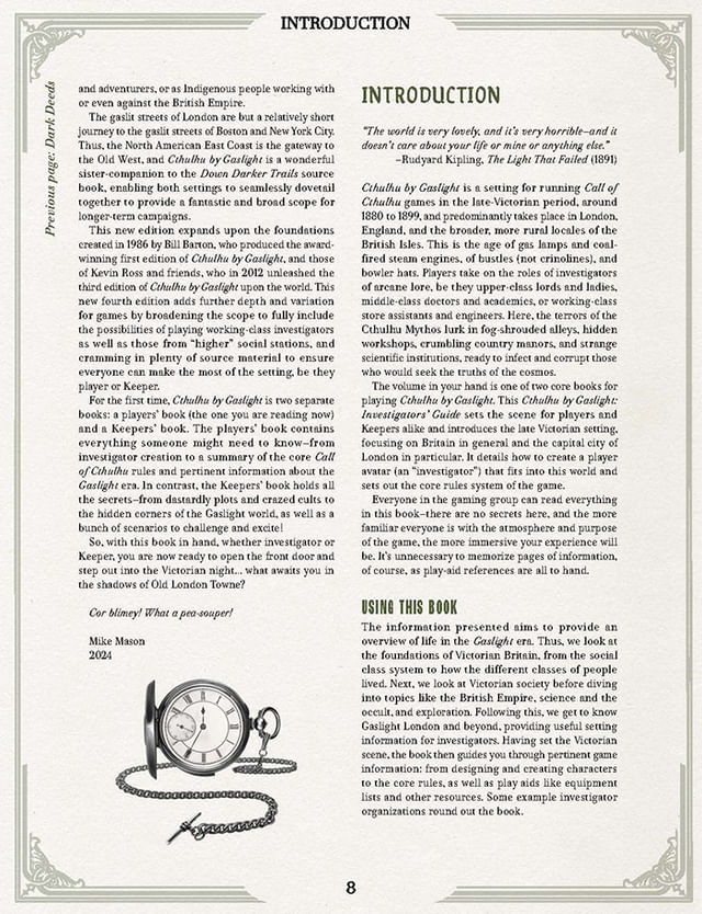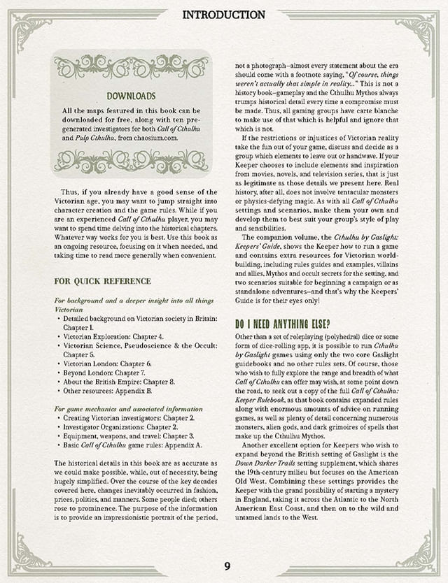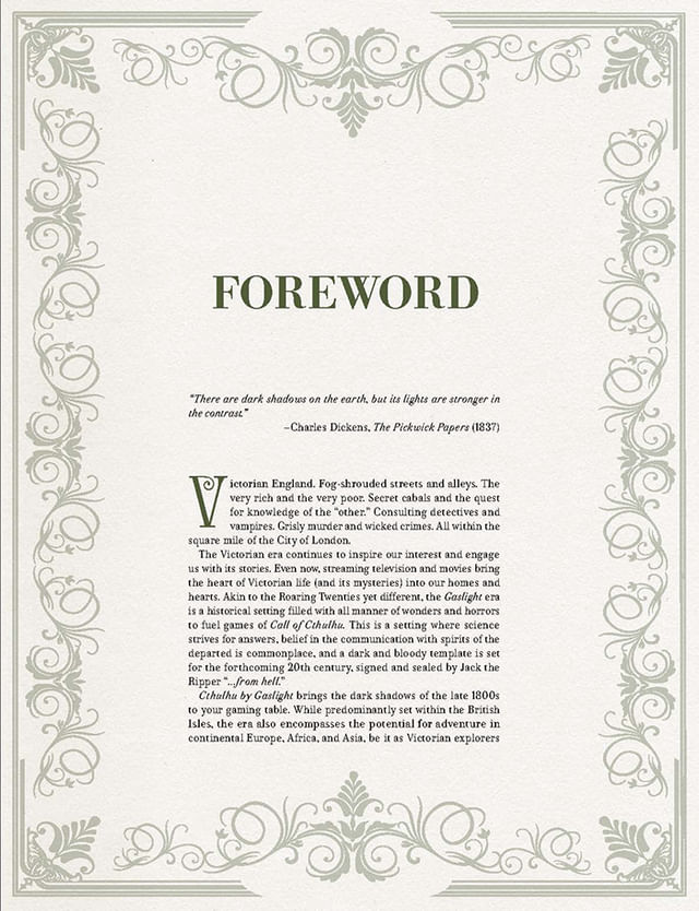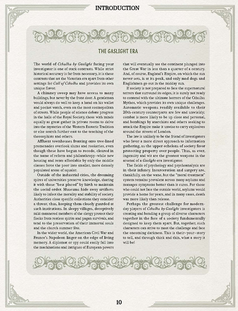 Táto kniha ponúka všetko potrebné na hranie Call of Cthulhu v ére plynového osvetlenia – tvorbu postáv, popisy viktoriánskej Británie, vybavenie aj nové pravidlá pre prieskum a okultizmus.