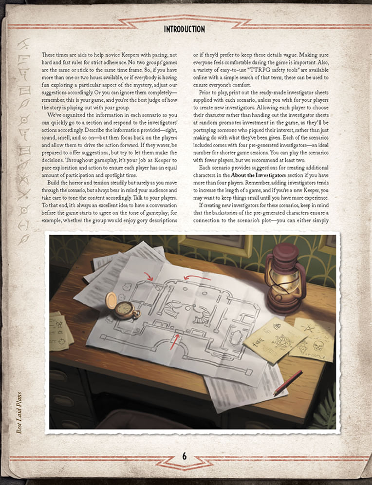 The three scenarios share a common theme—the investigators are up against the clock. Guidance for the keeper is provided to keep the action flowing and emphasize the uncaringness of the Mythos. There is also help for adding more investigators for larger group play.