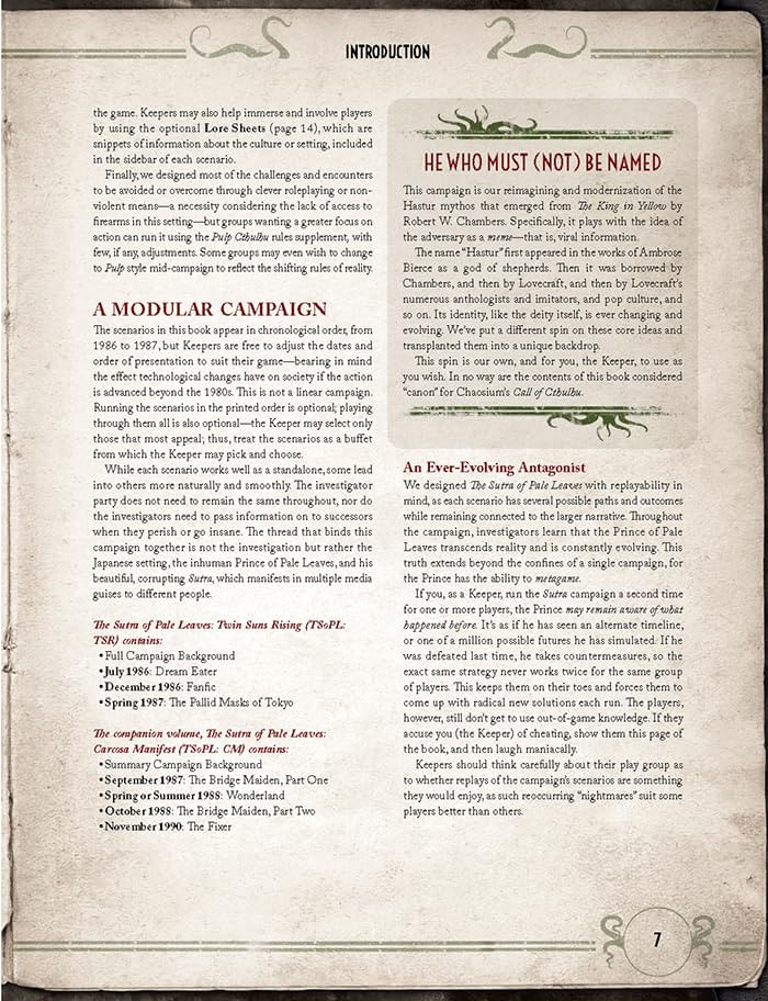 Unveiling the Cthulhu Mythos in 1980s Japan! A new take on an infamous Mythos entity—The King in Yellow. Three modular scenarios for standalone or campaign play. A comprehensive guide to the Sutra of Pale Leaves and its insidious effects, associated cultists, and monsters. Guidance on Japan during the frenetic 1980s boom era. Six ready-to-play investigators. A range of NPC Confidants. The Sutra of Pale Leaves: Twin Suns Rising is designed to be used with the Call of Cthulhu roleplaying game and, optionally, the Pulp Cthulhu supplement.