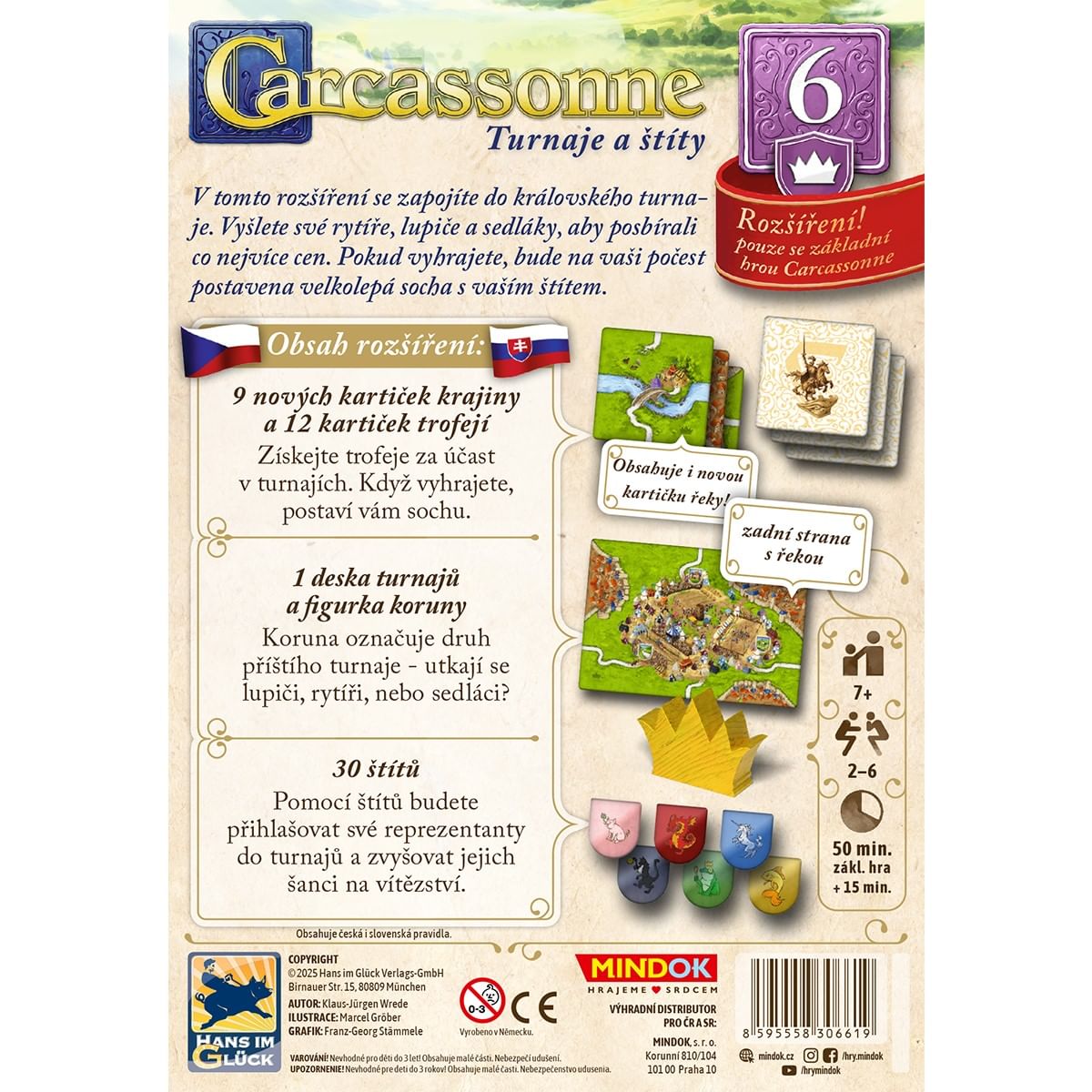 Carcassonne: Turnaje a štíty je šiestym rozšírením populárnej hry, ktoré sa nezaobíde bez základnej verzie. Je skvelé pre hráčov, ktorí chcú do klasického Carcassonne pridať novú vrstvu taktiky a napätia, so súbojmi o trofeje a bodovaním na konci hry na základe umiestnenia štítov. Hra je ideálna pre 2-6 hráčov.
