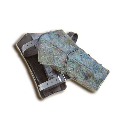 Železný škretí nátepník zhotovený z 1,4 mm hrubého plechu, vyvedený v zelenkastej patine. Dĺžka veľkosti M je cca 23 cm, dĺžka L cca 26cm. Zapína sa na dva kožené pásiky šírky 2,5 cm. Výborný doplnok nielen škretieho kostýmu!
