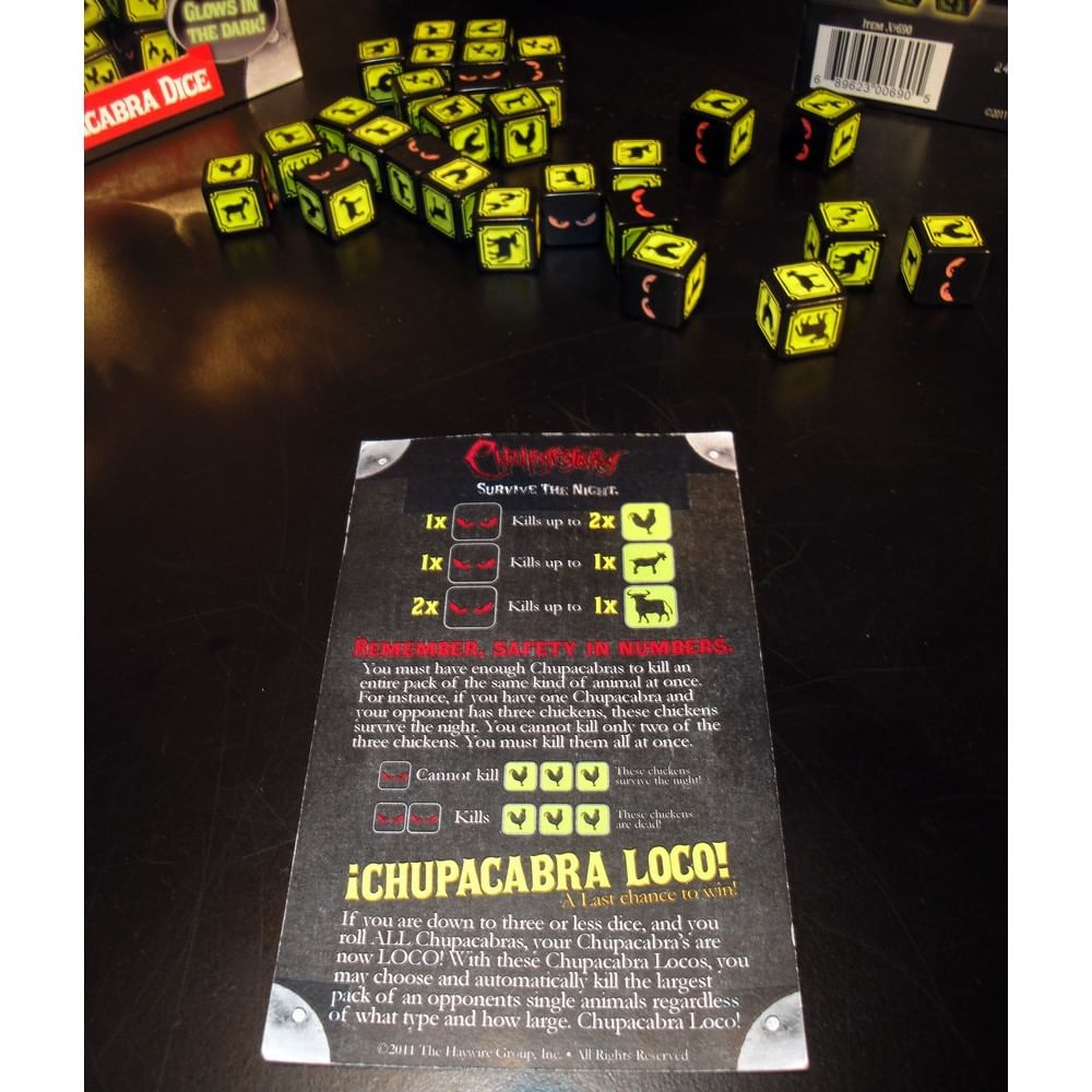 Akonáhle má hráč iba tri kocky, stáva sa z neho "Chupacabra Loco" (doslova "šialená Chupacabra") a môže jednému hráčovi vziať všetky zvieratá jedného druhu. Jednoduchá Kocková hra Chupacabra: Survive the Night môže zaujímavým spôsobom obveseliť vás a vašich priateľov kdekoľvek a kedykoľvek vďaka jednoduchým pravidlám aj netradičným svietiacim kockám.