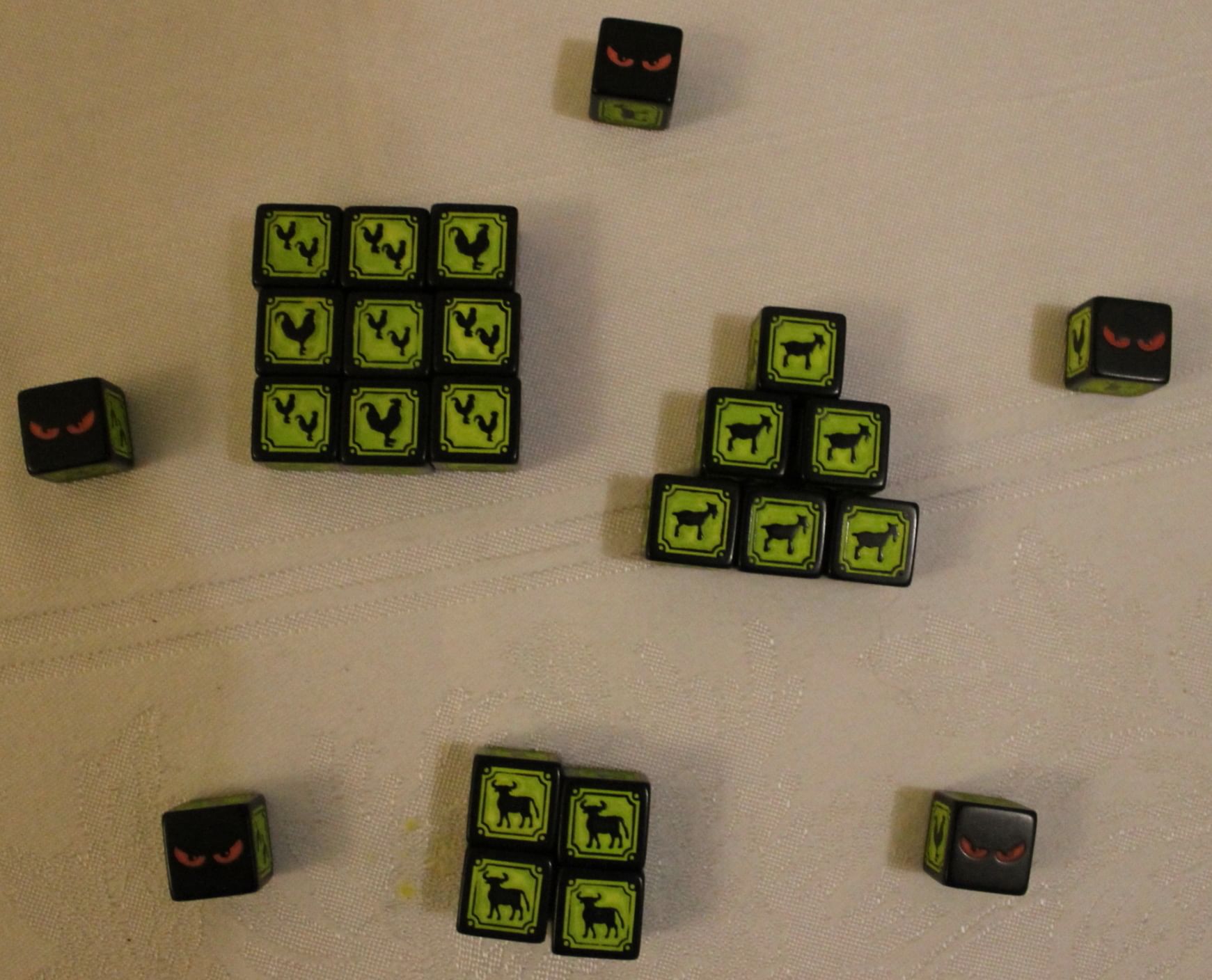 Po velké spokojenosti se Zombie Dice jsem sáhl po Chupacabře. Rychlá kostková hra jak průběhem tak na naučení. Až čtyři hráči hází na začátku šesti kostkama. Buď jim padne zvířena (slepice, kozy krávy) a nebo chupacabra. Zvířátka si dají podle druhu do stád či hejn. Chupacabrama můžou unést zvířata soupeřů. Jedna chupakabra unese dvě slepice nebo jednu kozu. Na krávu jsou potřeba chupacabry dvě. Háček je, že čím jsou zvířata ve větších skupinách, tím se hůř unášejí (na tři slepice potřebujete už dvě chupakabry, na dvě krávy čtyři atd.). Ukořistěné kostky si hráč nechává. Kdo nemá kostky prohrál. Čím má hráč méně kostek, tím je nebezpečnější, protože má větší šanci hodit "chupacabra loco" neboli na všech kostkách chupacabru. Chupacabra loco odnáší celé jedno stádo či hejno bez ohledu na počet zvířat v něm.