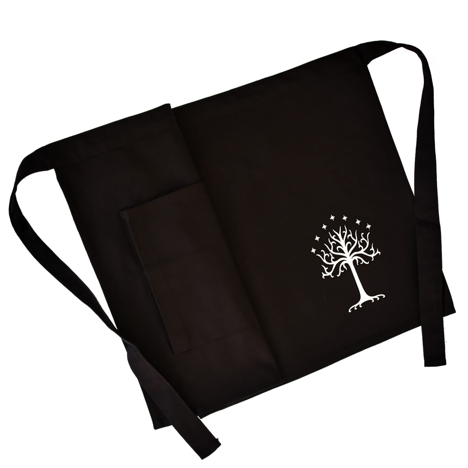 Čierna čašnícka kuchynská zástera so symbolom gondorského stromu z Pána prsteňov ponúka šikovné vrecká a bude pekným doplnkom kuchyne každého milovníka Stredozeme!