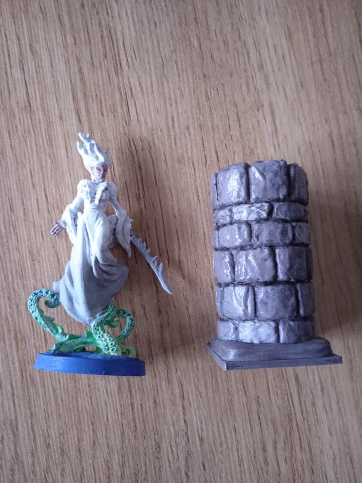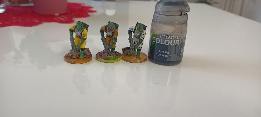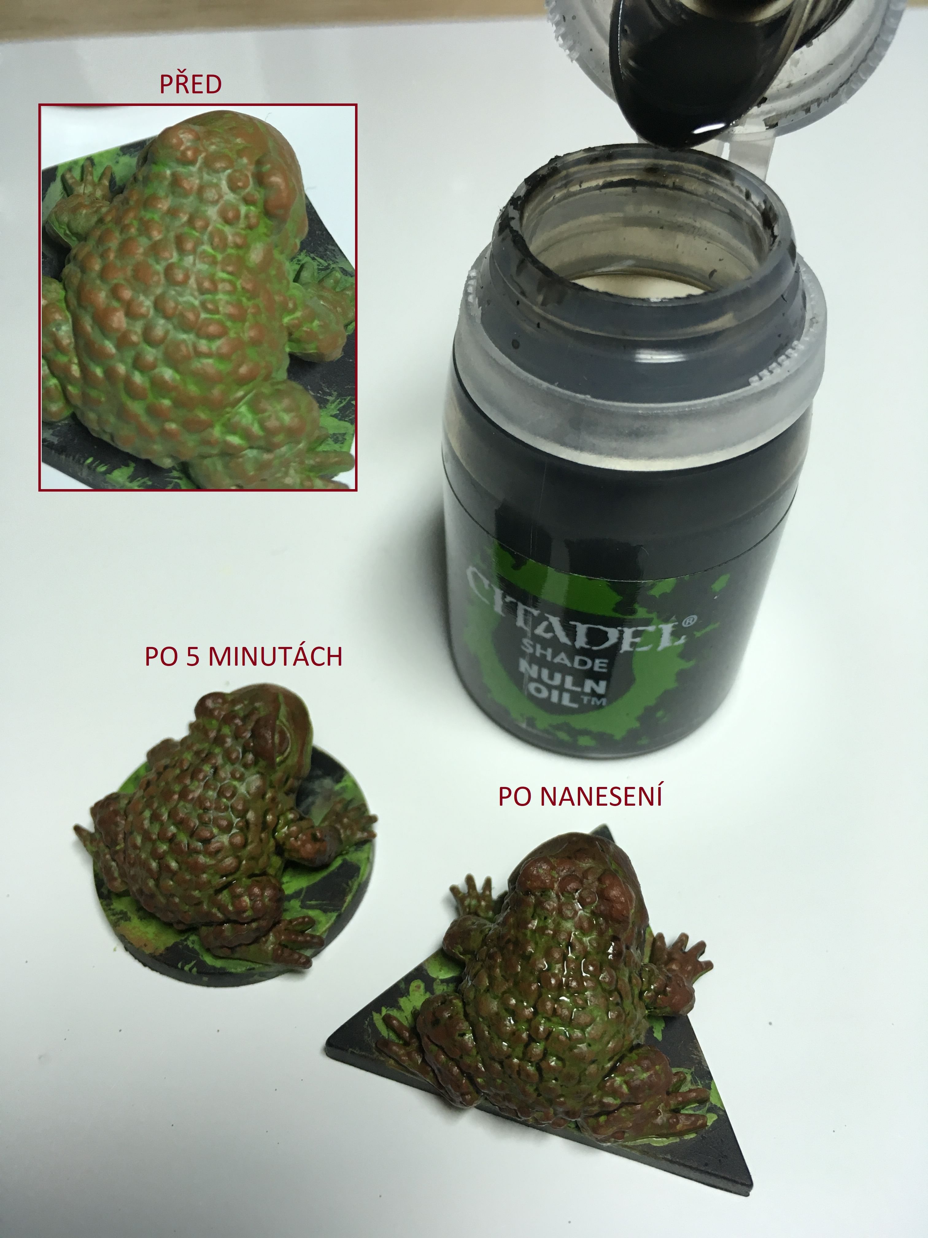 Černá wash barva, která dobře vytáhne detaily v záhybech a zákoutích na povrch. Osobně jsem ji skvěle využil při barvení sloupů, kde barva jednoduše vnikala do škvír mezi kachlemi. Dalším příkladem použití je figurka ducha, kterou jsem po nánosu bílé barvy přetáhl Nuln Oilem a následně zase přetáhl bílou, aby vynikali jen nutné detaily.