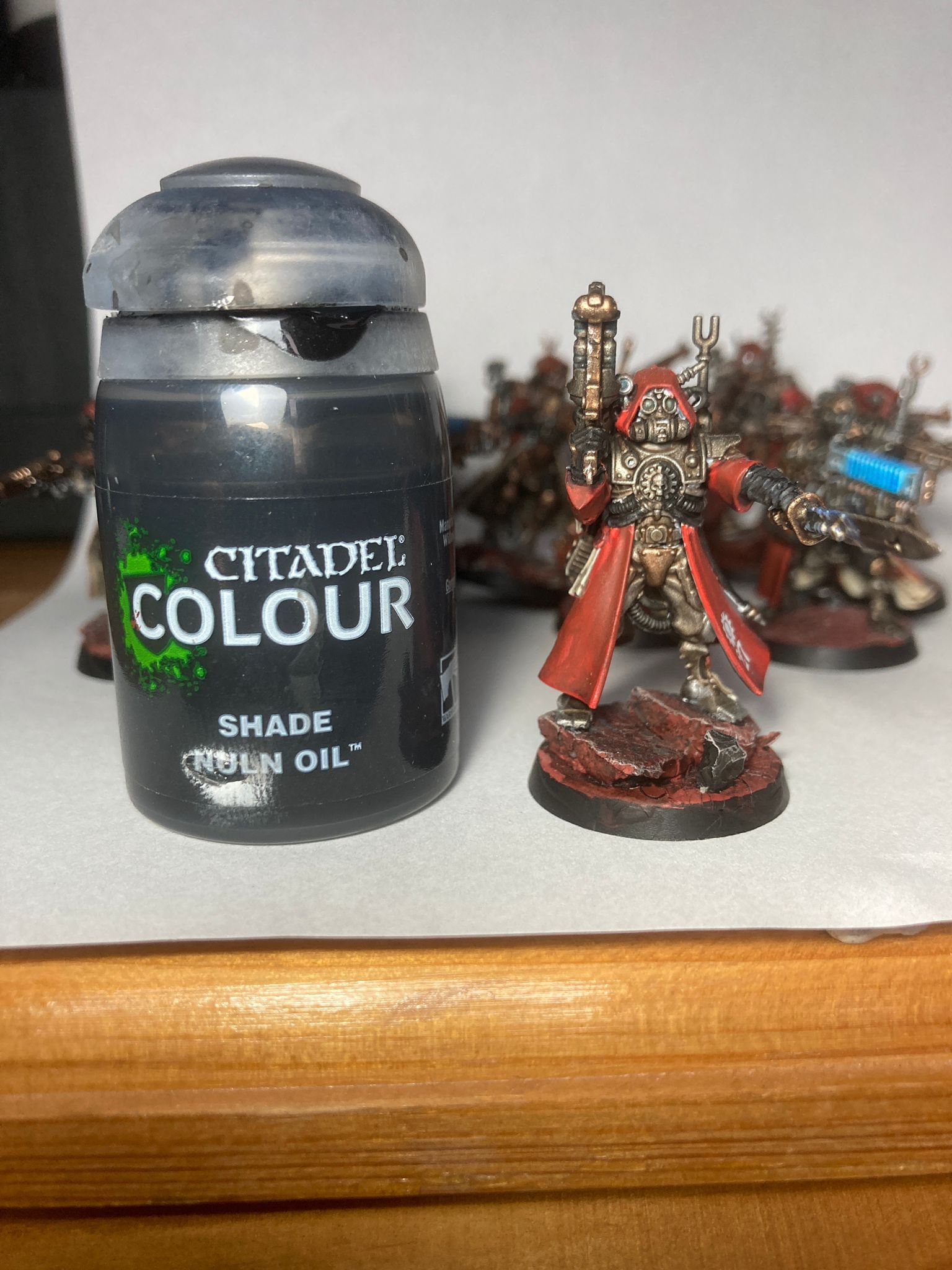 Pro mne nejčastěji využívaný shade v barvení miniatur warhammeru 40k. Skvěle provedená barva na zvýraznění stínů, či efektu použitých a starších kovových věcí, např. zbraní či kovových protéz :). Na obrázku použit na plášti kapitána a na stříbrných částech techmarina.