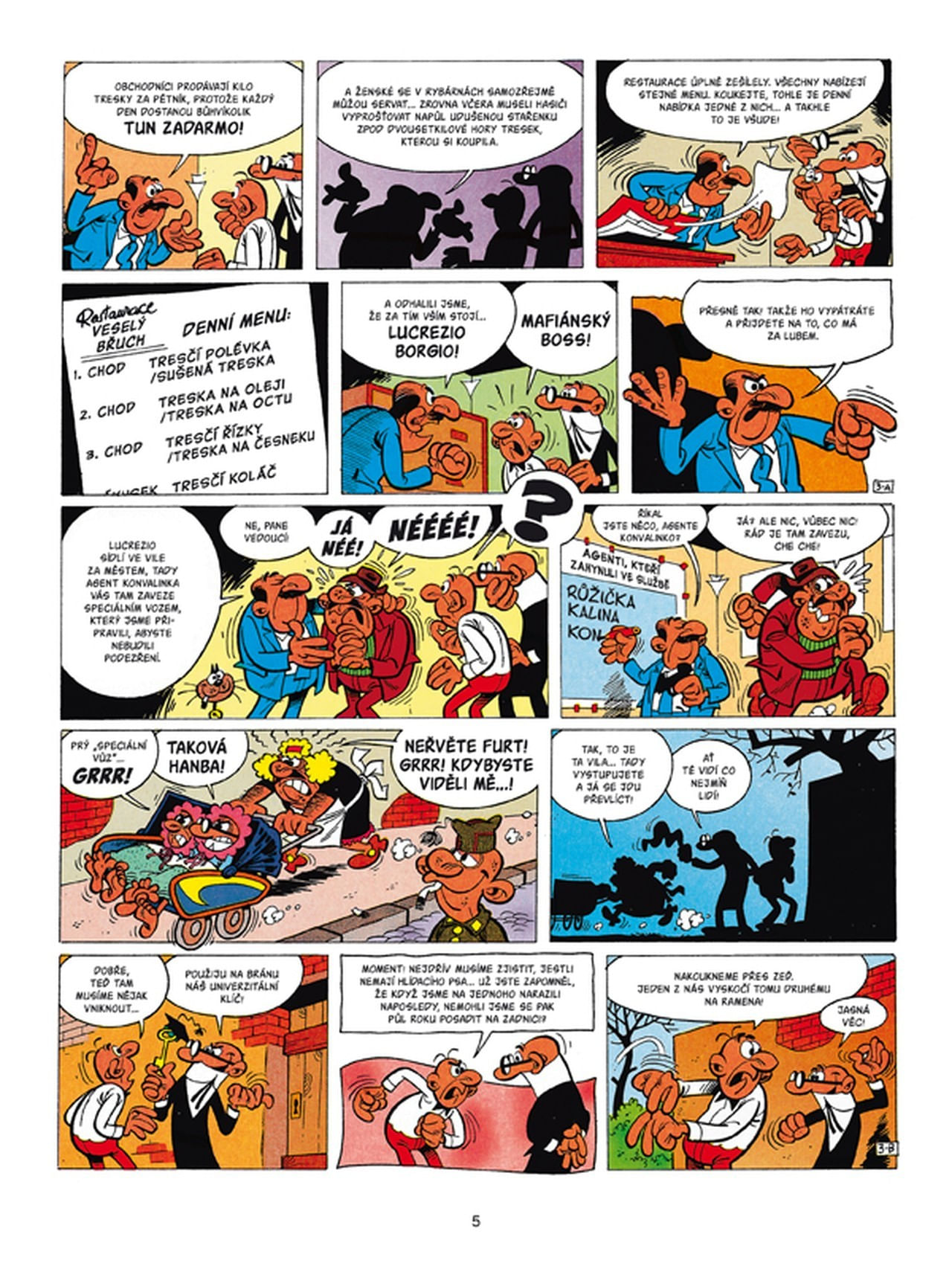 Clever a Smart sa ponorí do boja s mafiou! A to natoľko, že sa im podarí zaplaviť celé mesto. Nemajte však strach: gang strašného Lucrezia Borgia by síce rád poslal našich hrdinov spať s rybami, ale to sa zloduchom podarí, až naprší a uschne. A ešte iba možná. Piaty diel legendárnej španielskej série dopĺňame o dve krátke príhody zo života kultovej dvojice agentov.