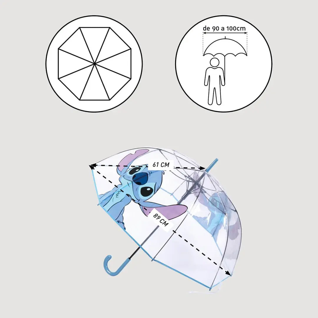Po otvorení má priemer 86 cm, takže ťa bezpečne ukryje pred dažďom, a vďaka priehľadnému materiálu budeš mať perfektný prehľad o okolí. Na dáždniku ťa navyše stráži roztomilý Stitch, ktorý ti spríjemní každý krok.