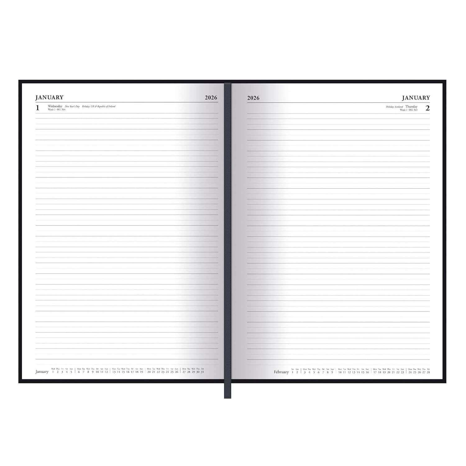 Diár v pevnej väzbe ponúka celkovo 352 strán a je v angličtine, s menovými informáciami, anglickými metrickými jednotkami, sviatkami a menami. Súčasťou diára je aj záložka a elastické pútko na zapínanie.