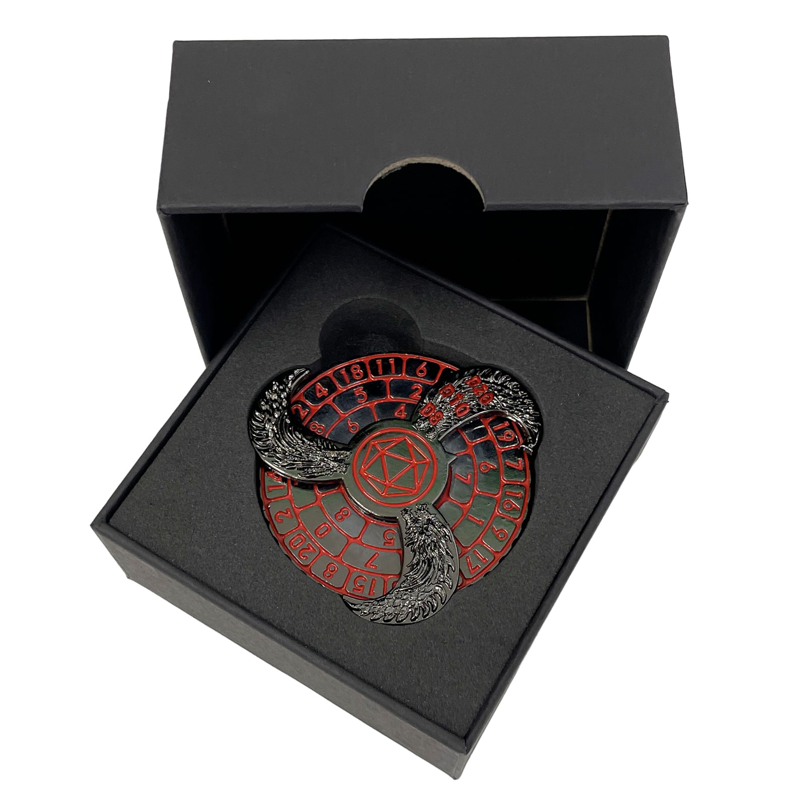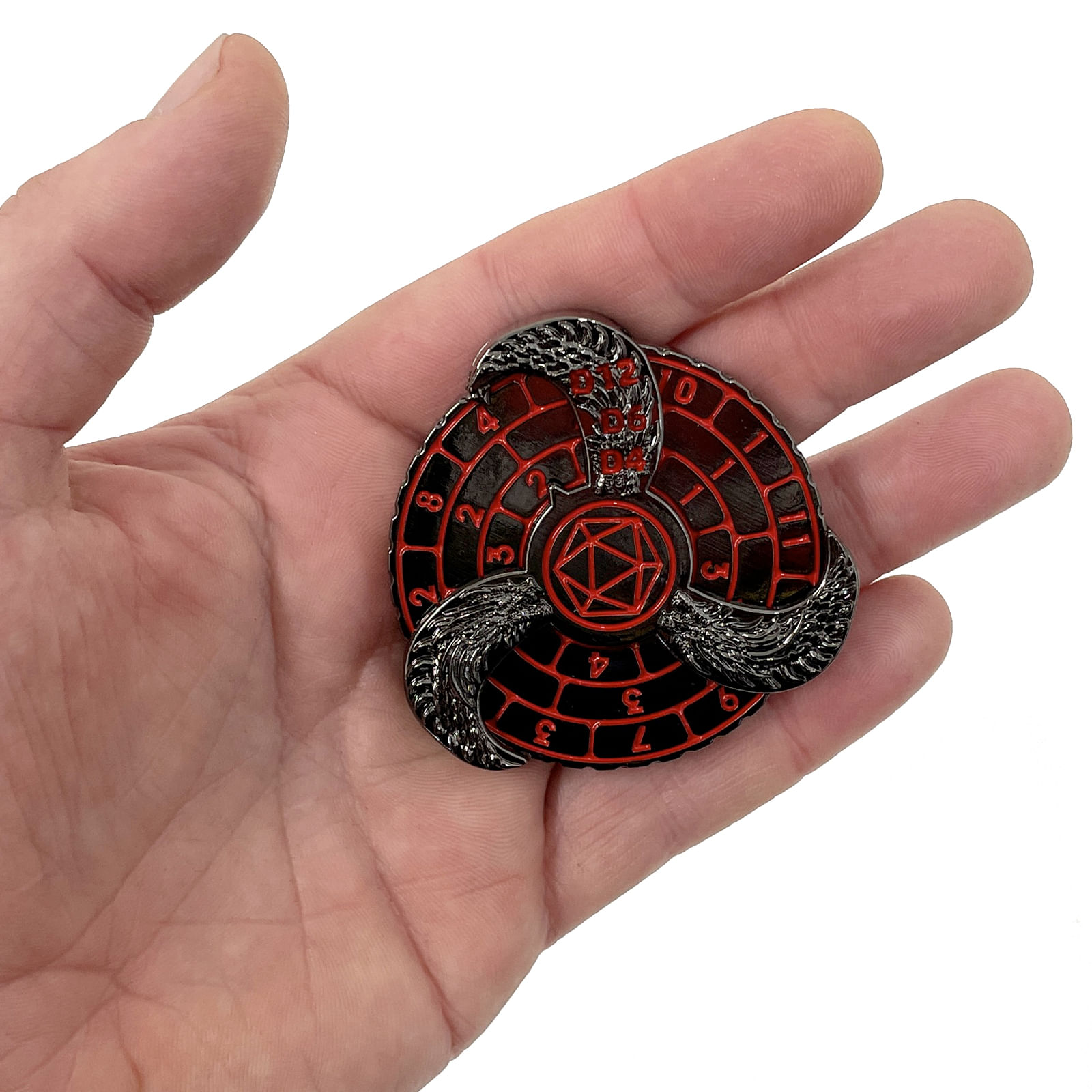 Spinner očarí elegantnú kombináciu chrómovej základne a červených čísel, 3 kotúčové kotúče sú zdobené rytmi drakov. Váži 135 g a má priemer asi 6 cm.