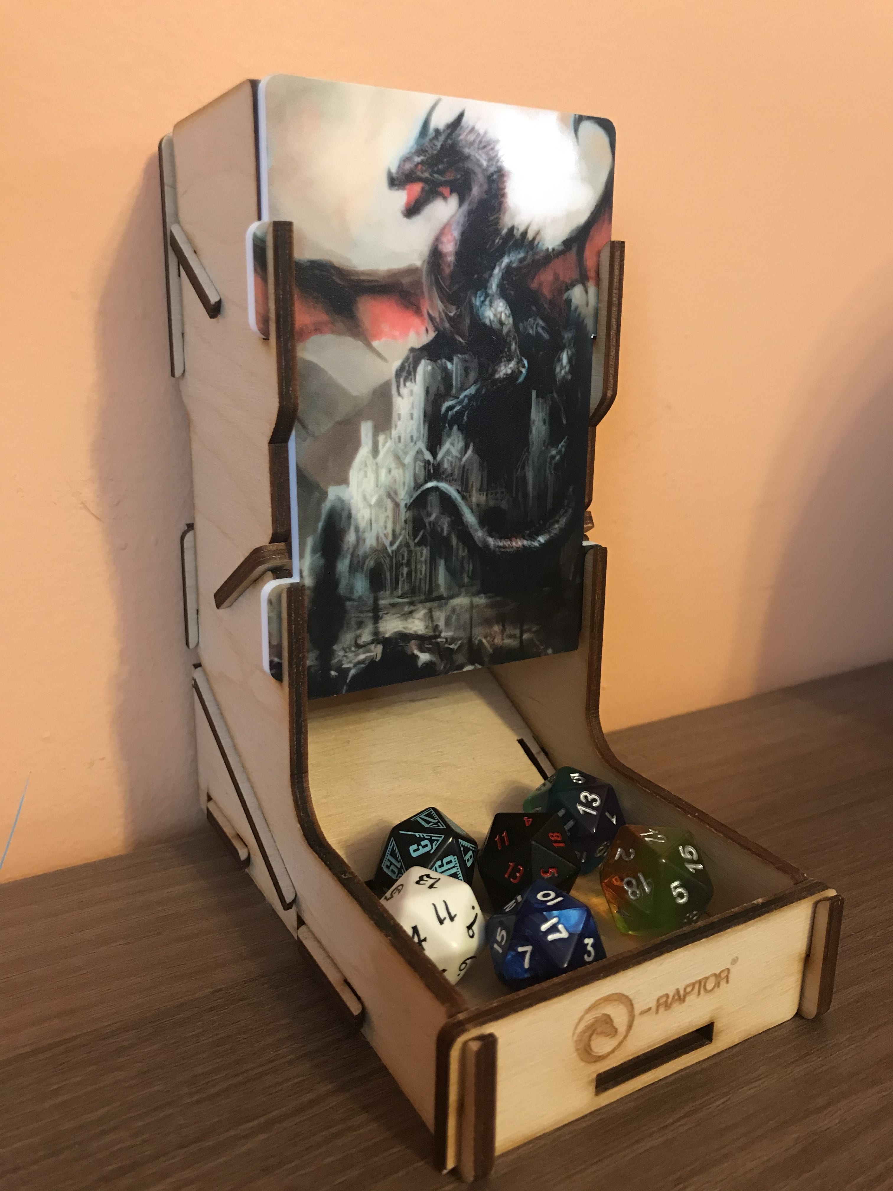 Moje první věž na házení kostek a musím říci, že jsem s ní velmi spokojená. Dřevo je spolu s přední plastovou stěnou bytelné, neboť vydrží nárazy i kovových kostek.