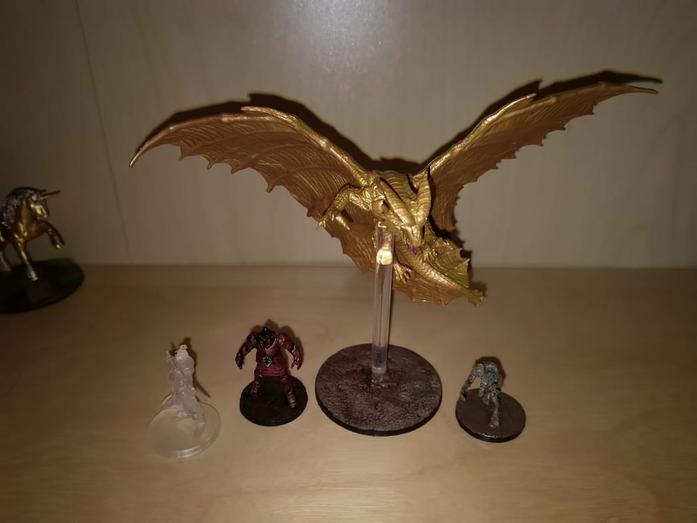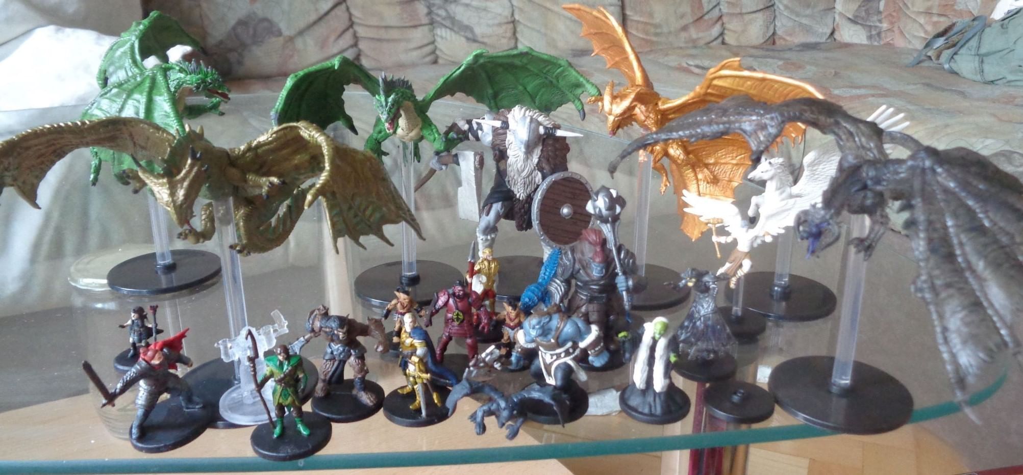 Já sice na ty nejcennější draky neměl štěstí, nicméně jsem našel kromě již zmíněných také bronzového a šedě průsvitného stínového černého draka (viz fotka). Kromě draků jsem získal ze série i řadu dalších zajímavých figurek; ku příkladu ledového obra se sekyrou, dost divně vyhlížejícího většího hlubinného orka s obřím kyjem (Orog orc), prostorově velmi výrazného obyčejného modrošedivého orka (který co do rozměrů vypadá trochu jako z Warhemmeru), reprezentativně vyhlížejícího blonďatého paladina, poněkud bizarní ale jinak celkem pěkný poletující šedivý rozevlátý přízrak (wraith), klasické gobliny se sekáčky, asi nejpěknějšího reprezentanta orkům podobné rasy srstnaté bugbearů v rámci IotR, zelenou čarodějnici (hag), zajímavého elfího druida, banditu s mečem a šátkem přes obličej,červený hobgoblin, pegase, deva anděla s kladivem, gnómku kouzelnici… viz foto.