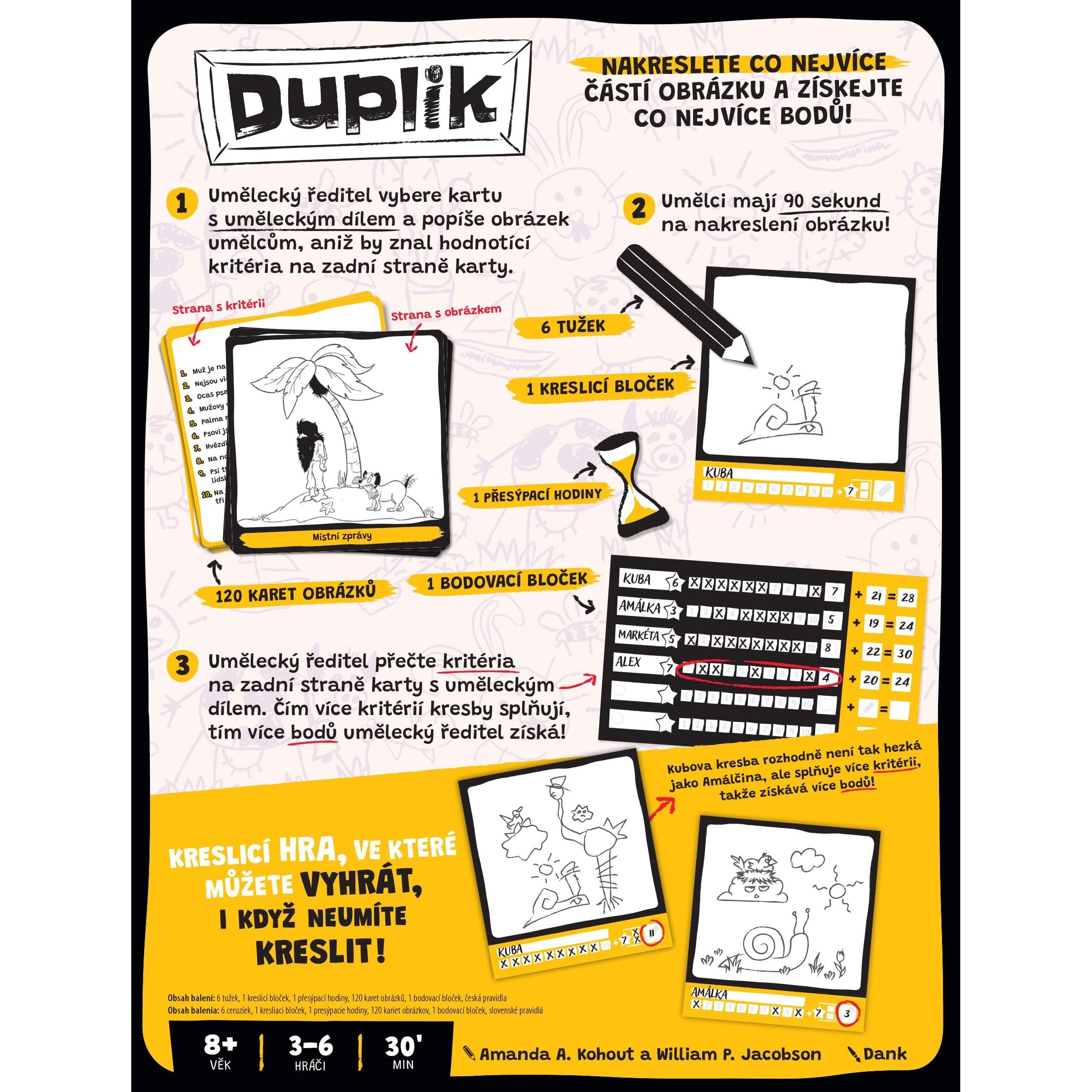 V hre Duplik budeš kresliť čo najviac častí obrázku a za to získavať body! Tie, ako umelecký riaditeľ, vyberieš kartu s umeleckým dielom a to čo najpresnejšie popíšeš umelcom. Získaš jeden bod za každé kritérium splnené aspoň jedným z hráčov. Umelecký riaditeľ pritom nepozná hodnotiace kritériá na zadnej strane karty.