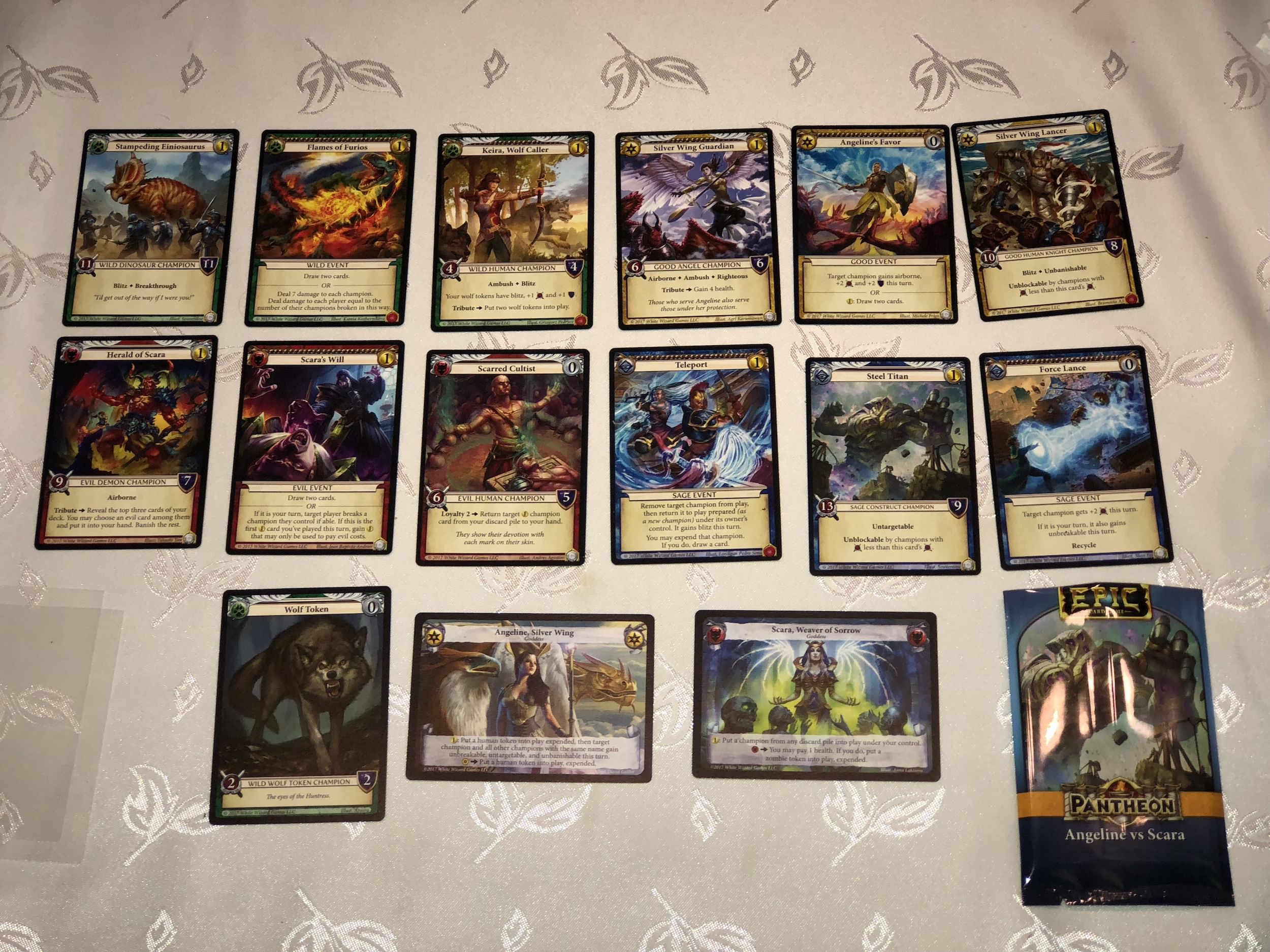 Balíček Epic: Pantheon Gods - Angeline vs Scara Booster pre kartovú hru Epic pridáva 12 nových kariet, 2 karty božstvá / žetónu a 1 obojstrannú žetónové kartu.