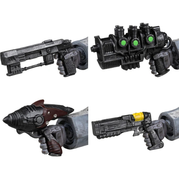 V balení tiež nájdeš: Short plazma pištoľ, alien blaster pištoľ, laser pištoľ, T-60 pištoľ, Gauss minigun, light machine gun, Black Diamond Sword, štyri vymeniteľné ruky a stojan.