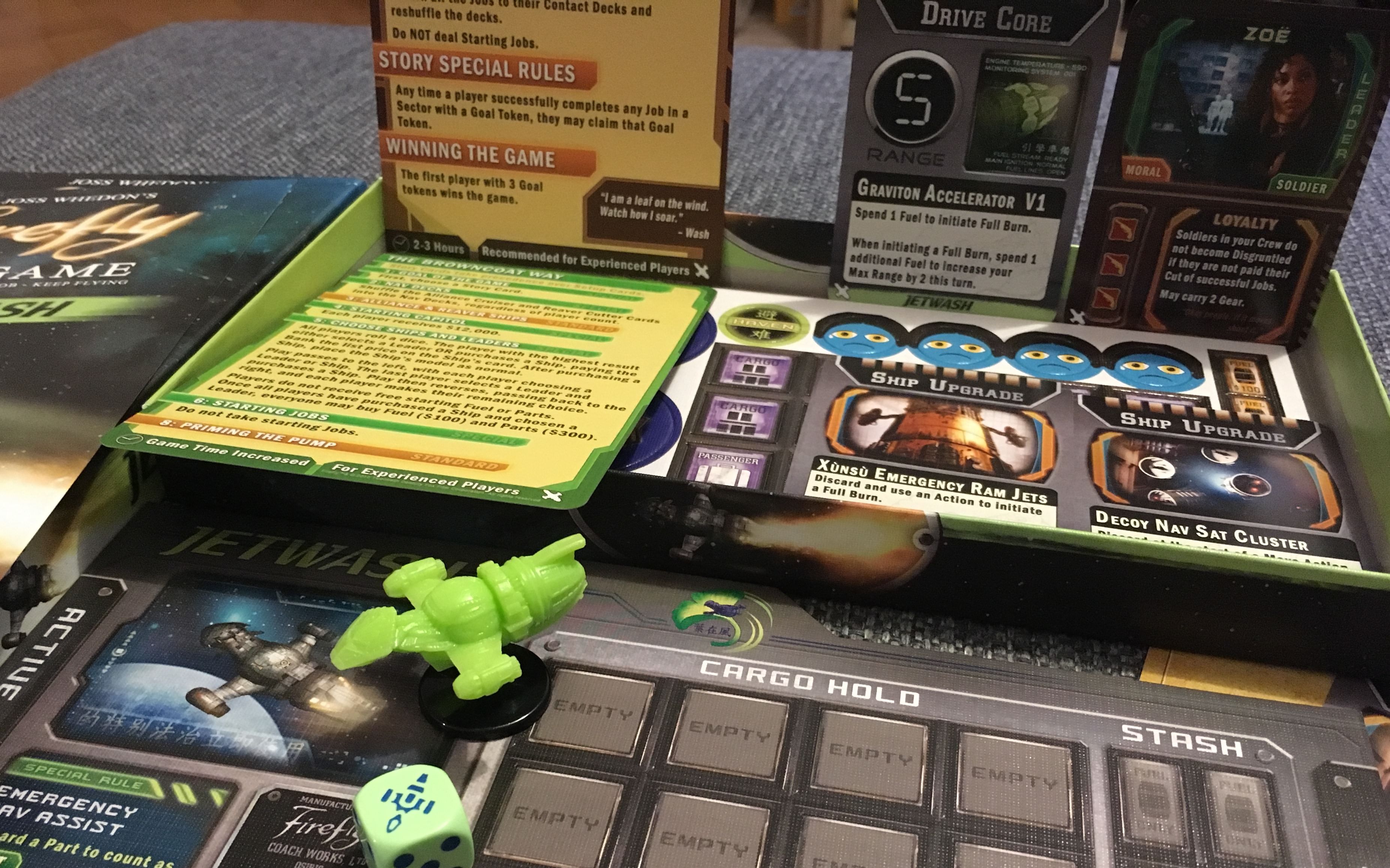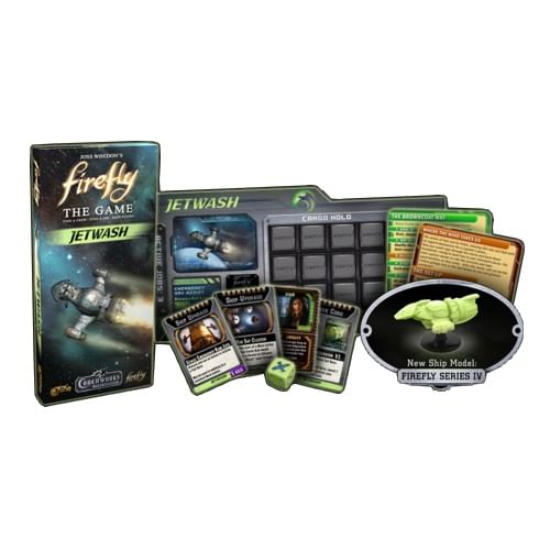 Toto mini rozšíření obsahuje překvapivě mnoho pro hru Firefly - nový model lodě s kartou a speciálními upgrady, kartu Zoe jako Leadera lodě, speciální jedovatě zelenou kostku a nové Story karty. A navíc umožňuje hrát Firefly ve více lidech. Jetwash je, stejně jako Esmeralda, určen spíš pro hráče, kteří rádi hrají legálně :-)