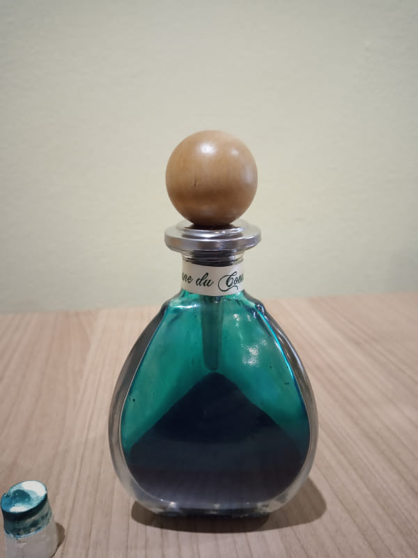 Výška flakónu je 10 cm, šírka 7 cm, flakón je trojboký. Vyrobený je z bezfarebného skla. Súčasťou je kvalitná korková zátka.