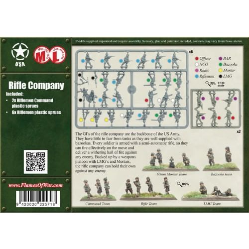 Sada US Rifle Company obsahuje 156 plastových modelov americkej pechoty pre vojnovú hru s miniatúrami Flames of War. Modely nie sú zložené ani nafarbené.