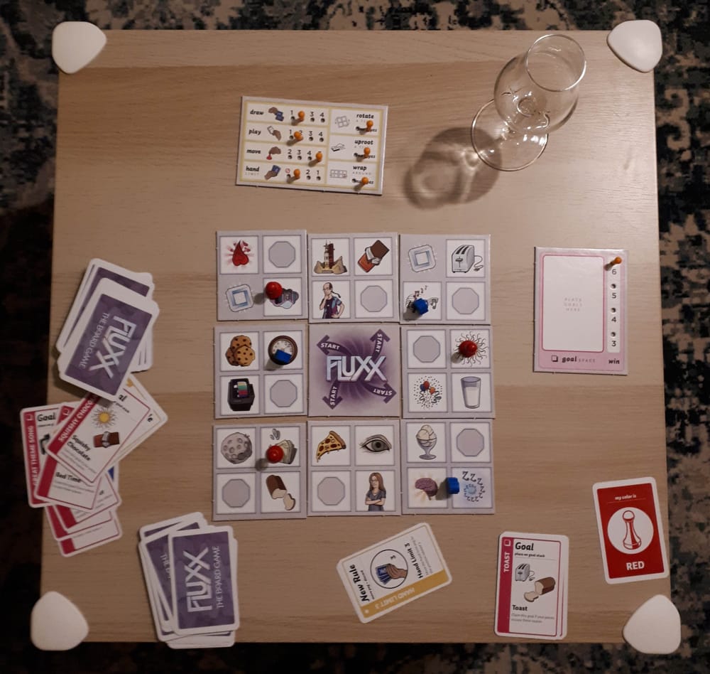 Fluxx: The Board Game vychádza z rovnomennej kartové hry, ale prináša množstvo zmien: nové pravidlá, ciele aj nové herné diely. Hráči začínajú hru s tromi dielmi v stredu mriežky zostavené z 3x3 dlaždíc (tie majú rôzne motívy ako čokoláda, slnko, sušienky, apod.) A snaží sa nazbierať 3-6 cieľových kariet (požadovaný počet sa môže počas hry meniť).