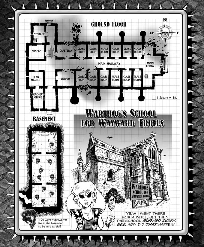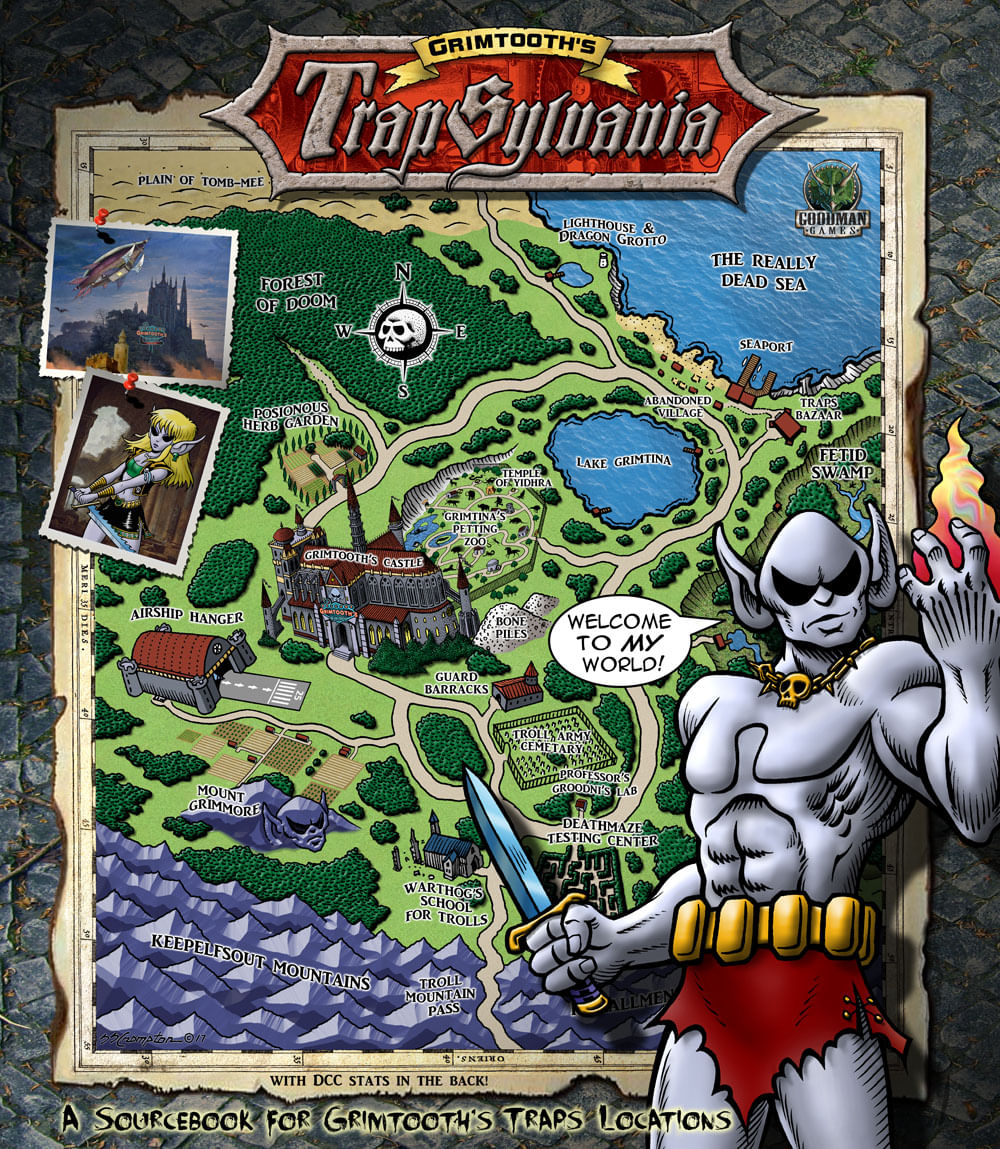 Spustite si vlastnú Grimtoothovu kampaň alebo si vyberte miesta, ktoré môžete použiť vo svojich vlastných dobrodružstvách v jednej lokalite. Preskúmajte Grimtoothove jaskyne, navštívte jeho Vnútornú svätyňu, uniknite z Testovacieho centra Smrťozubov, navštívte Warthogovu školu pre trollov, prevezte sa na Grimtoothovej vzducholodi, prezrite si Grimtininu ZOO pre domáce zvieratá alebo sa stratte v Nekonečnej chodbe chodieb a mnohých ďalších gigantických miestach skazy. Každé z týchto neslávne známych miest obsahuje mapy, popisy, údaje o nehráčskych postavách, scenáre, to všetko s podrobnými štatistikami DCC a množstvom kresieb od výtvarníka Traps SS Cromptona.