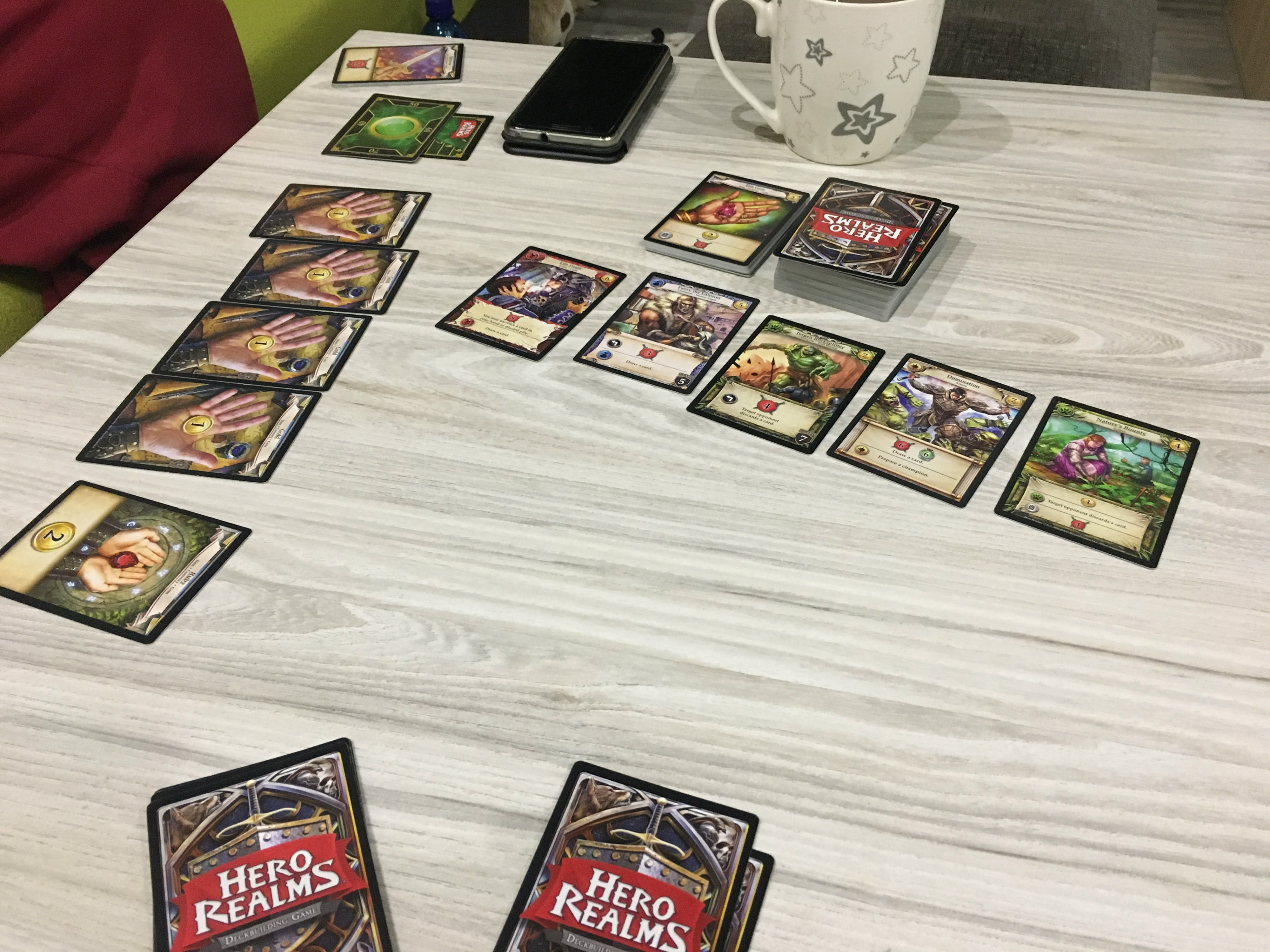 Myslel jsem si ze to bude neco podobneho jako Dominion. Sice ma to podobne mechaniky ale hra neni tak zabavna. Velka nevyhoda je ze se doberete 5 karet zahrajete je v libovolnem poradi a to je vse. Zadne uvazovani jak postupne vykladat karty a to je skoda.