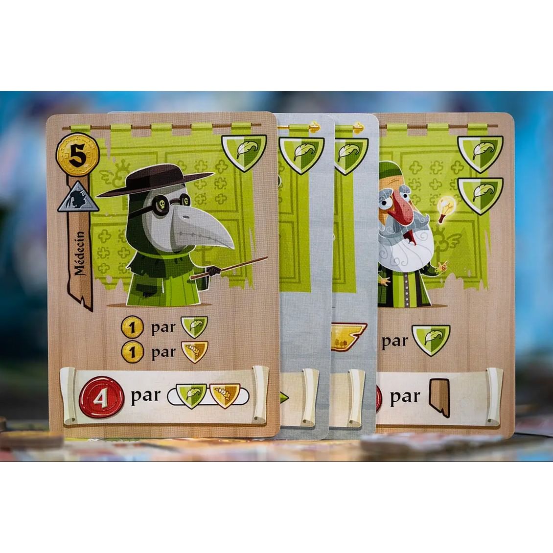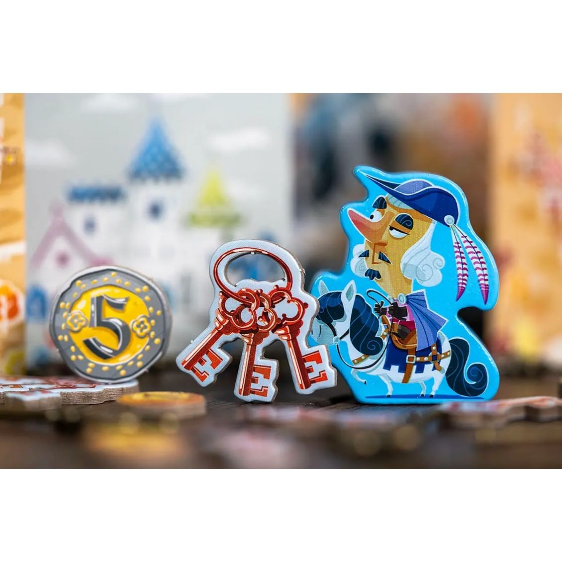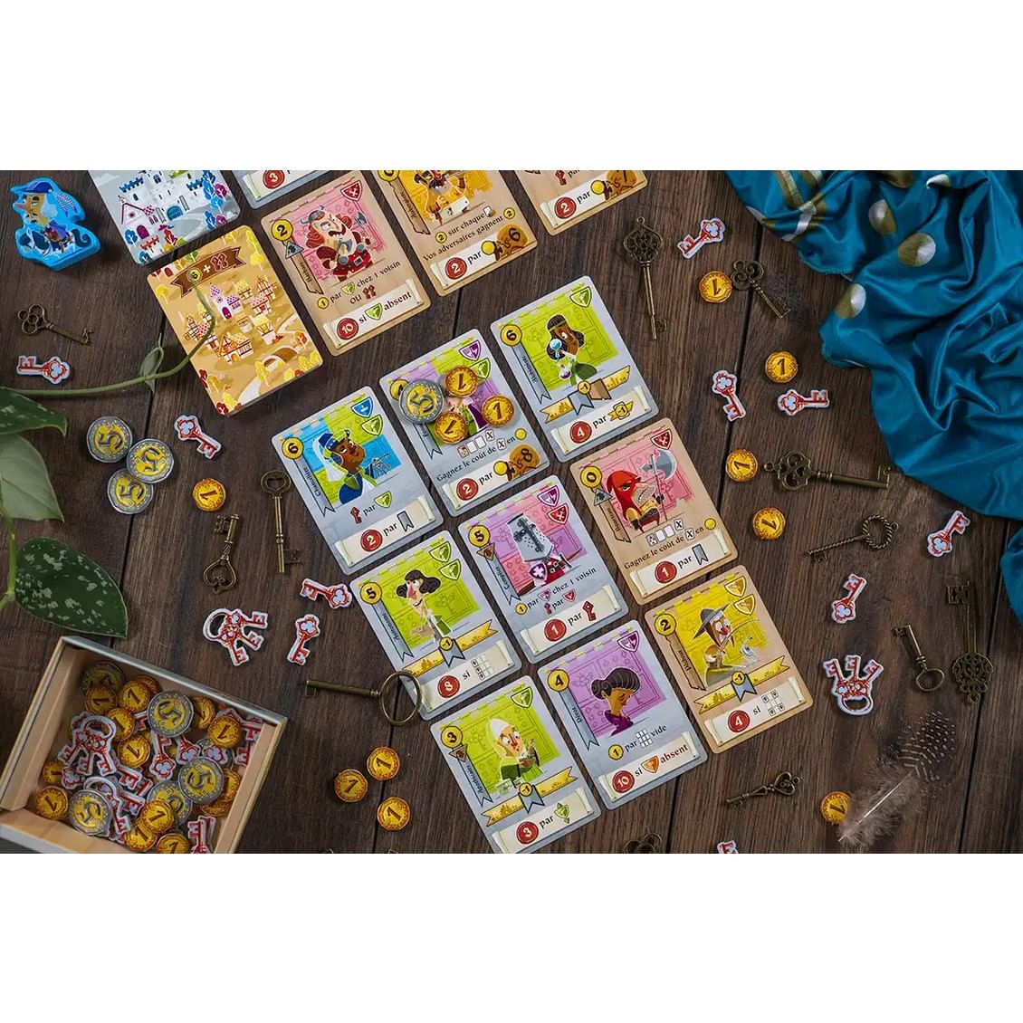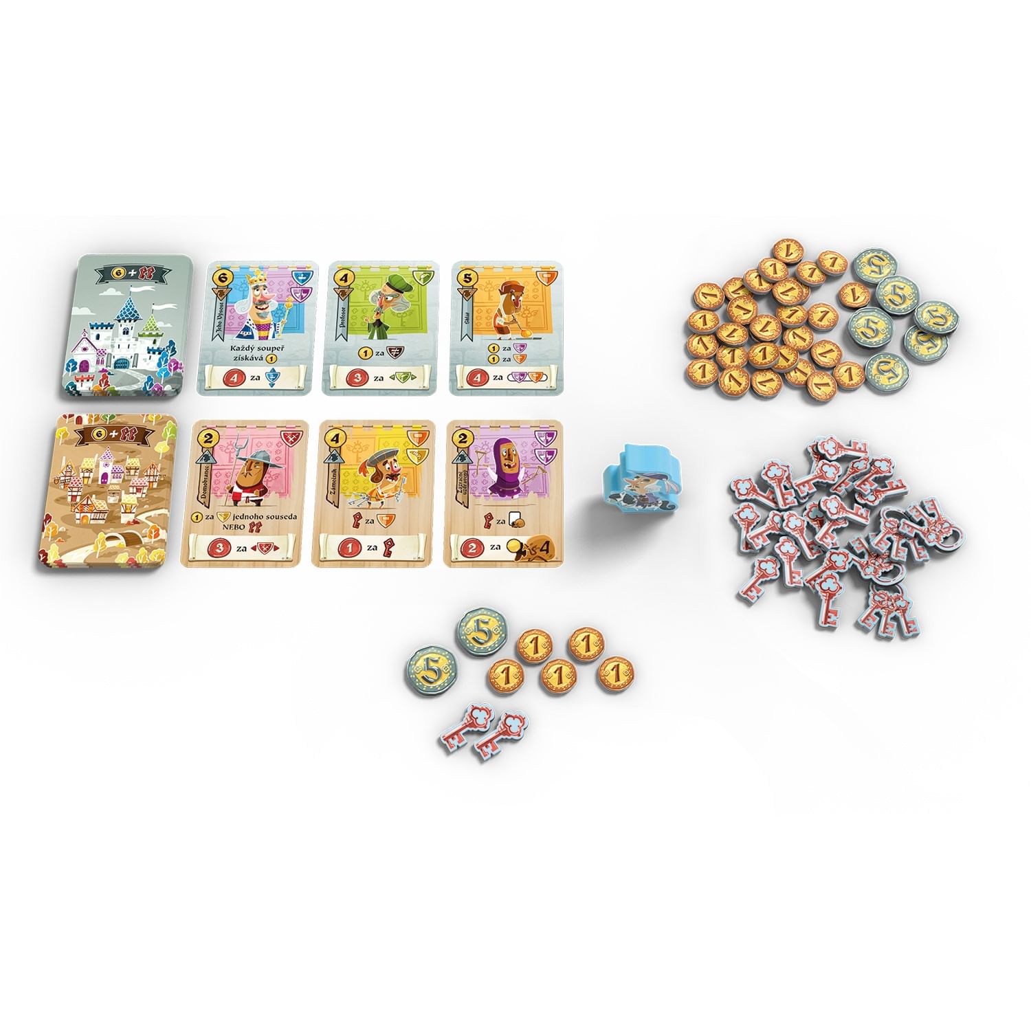 Skombinujte svoju družinu z hradu aj podhradia do mriežky 3×3. Každá postava prináša svoje vlastné erby a rôzne bodovanie - tu za erby v rade, v stĺpci, za žiadne erby, za to, kde sa nachádzajú, alebo za mešce, kde si môžete uložiť prebytočné peniaze. Prenosná krabica, pekné rozloženie pre 2-5 hráčov a veselé kreslené ilustrácie dvoranov a sedliakov robia z tejto hry istý hit na výlety a dovolenky!