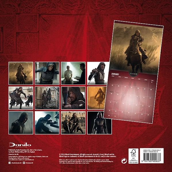 Nástenný kalendár na rok 2017 s motívmi z filmu Assassins Creed. Rozmery rozloženého kalendára sú 60 cm x 30 cm.