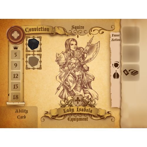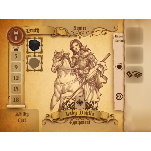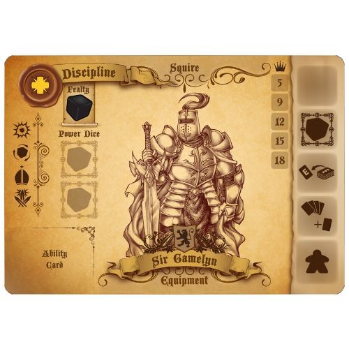 Za vplyv, ktorý počas turnaja získate, môžete naberať pomocníkov, pomocou kociek a kariet potom zvyšovať schopnosti svojich rytierov.