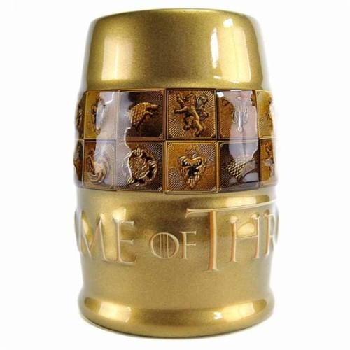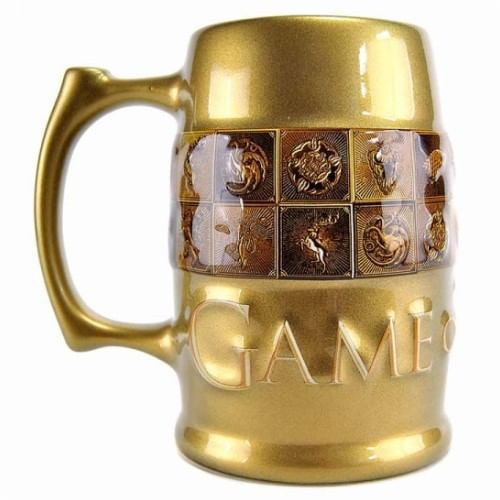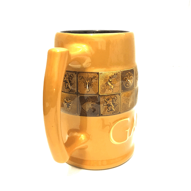 Krémovo zlatý keramický pivný pohár s ozdobnými reliéfmi rodov slávneho amerického fantasy seriálu Game of Thrones - Hra o tróny.