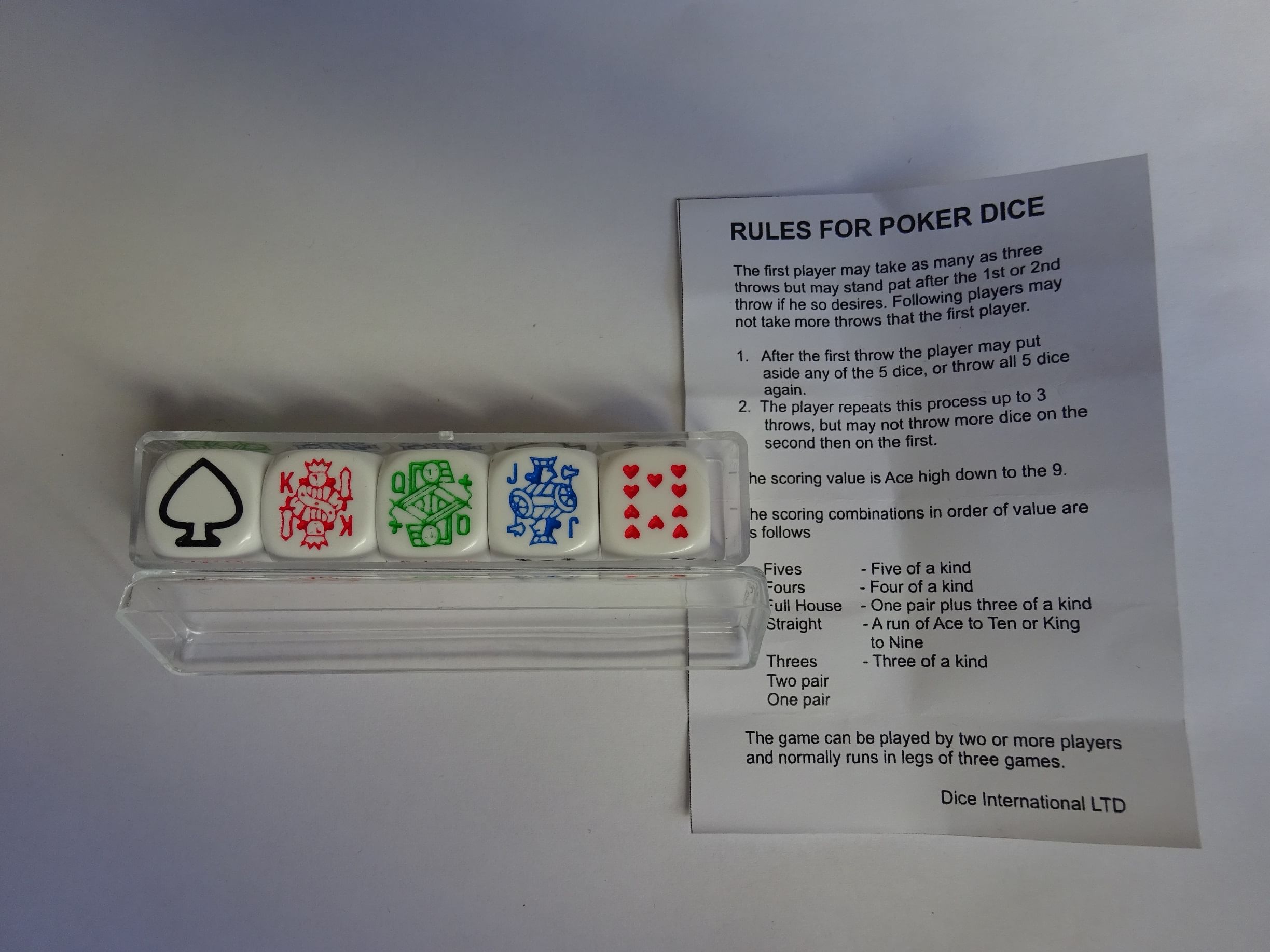 Sada piatich kociek s kartovými symbolmi (od deviatky až po eso) určené na kostkovému Pokru . Kocky sú kvalitne spracované (symboly sú vtlačené), hra s nimi je jednoduchá a zábavná.