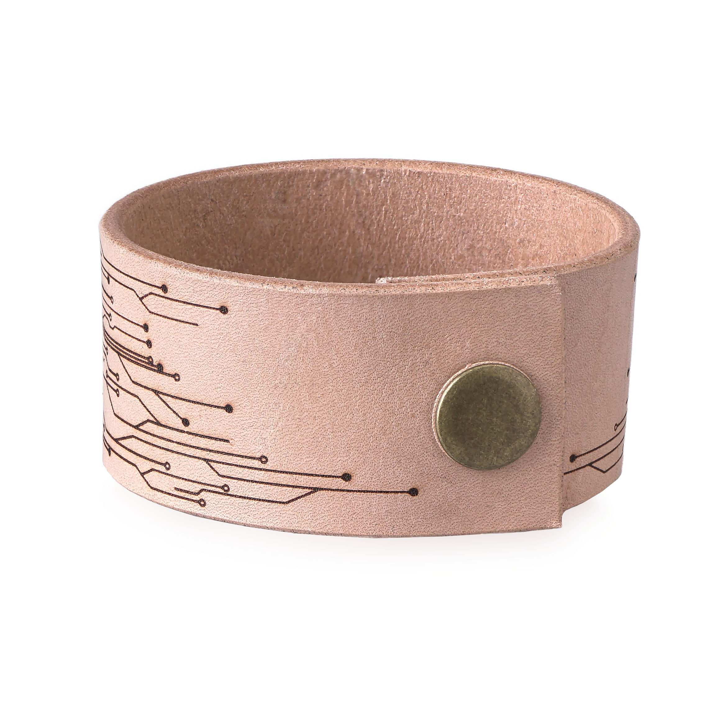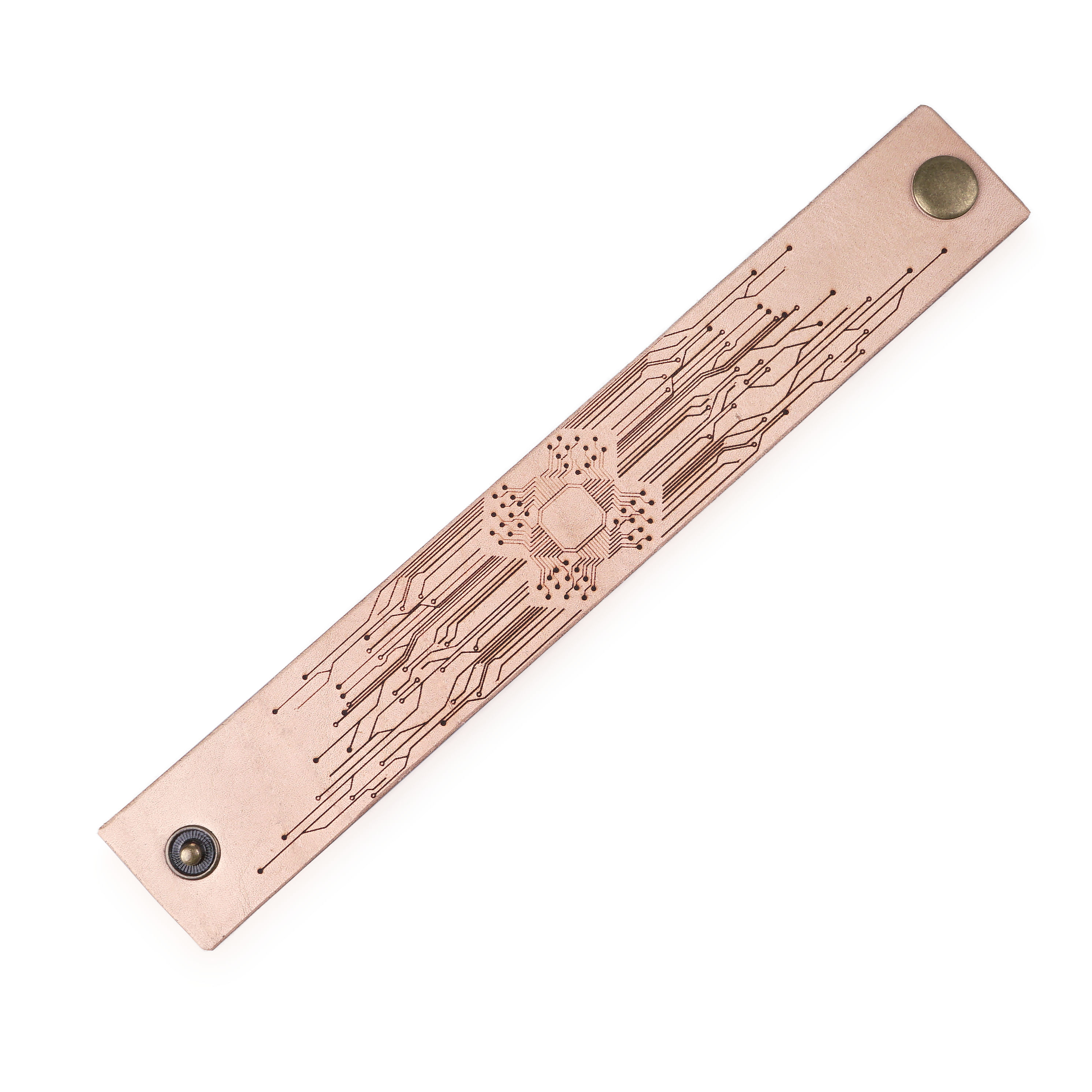 Náramok sa zapína na cvoček a môžete si vybrať z dvoch rôznych dĺžok - 21 cm (obvod zápästia 19 cm) a 24 cm (obvod zápästia 22 cm). Šírka je 3 cm a náramok zdobia ornamenty inšpirované elektronikou a plošnými spojmi. Kúpte si kyberpunkový náramok ešte dnes, zajtra už môže byť neskoro.