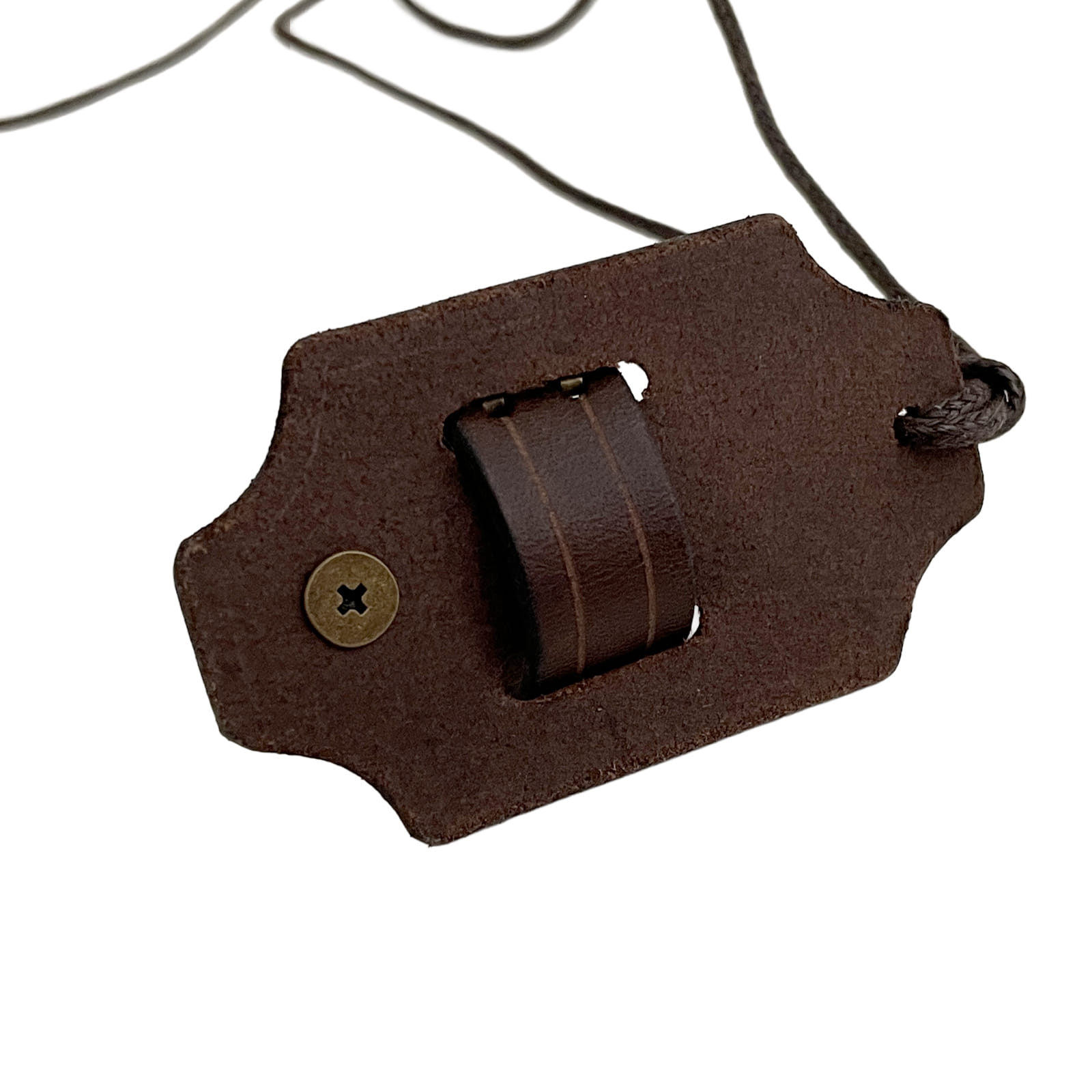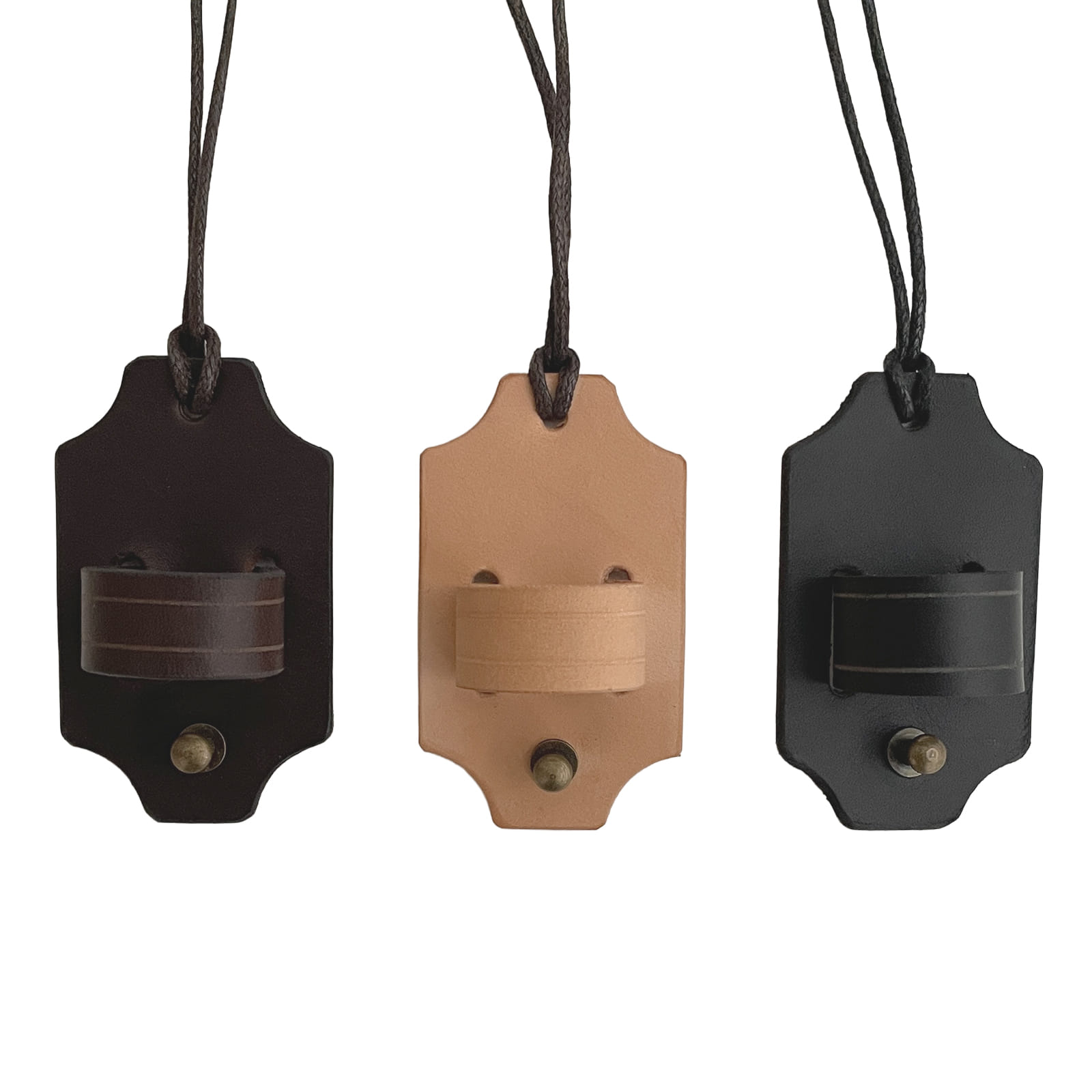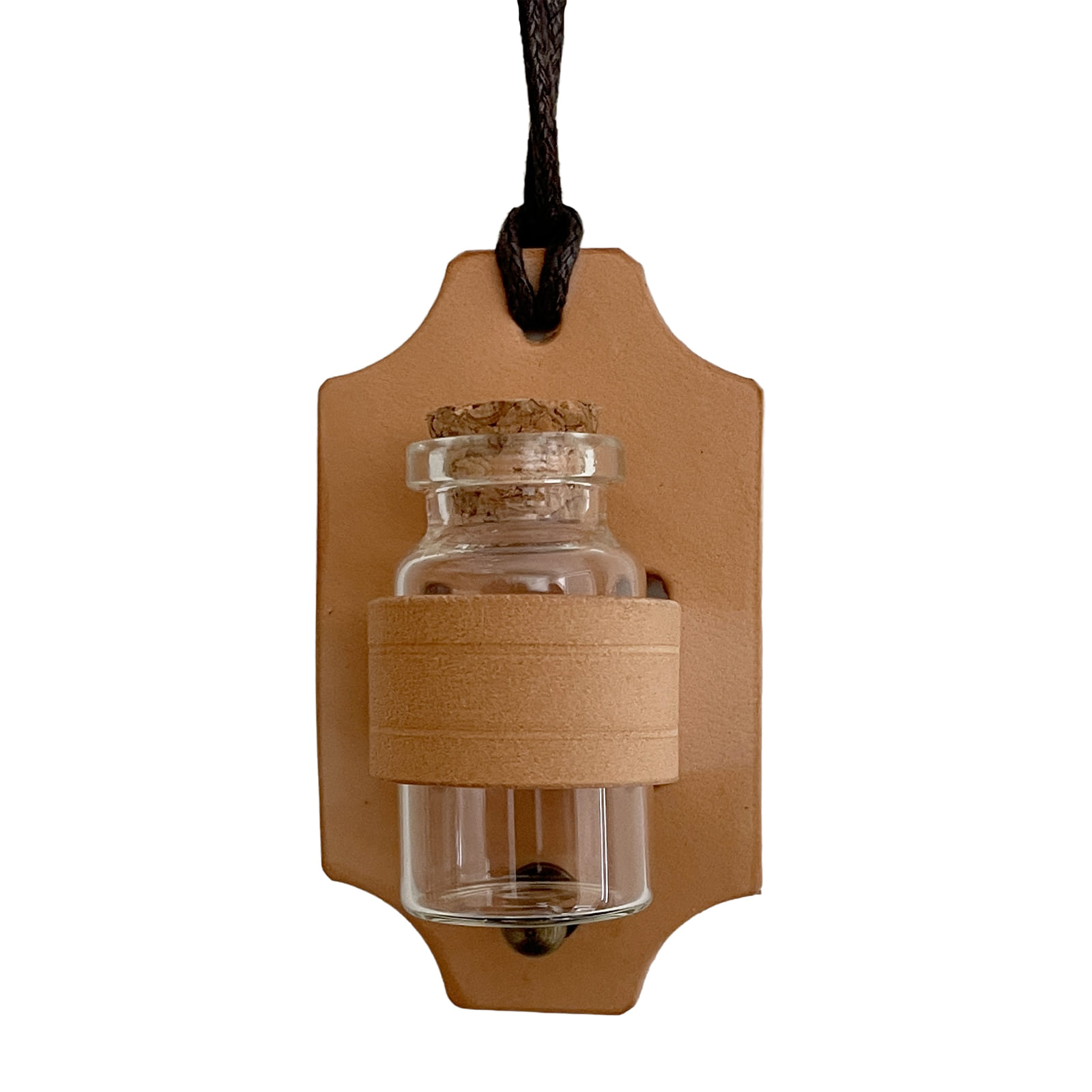 Záves s rozmermi 7 x 4 cm je vyrobený z kvalitnej hovädzej kože u nás v imago dielni – ručne farbený a šitý. Sklenenú fľaštičku s veľkosťou 4 cm s korkom drží pevne a bezpečne!
