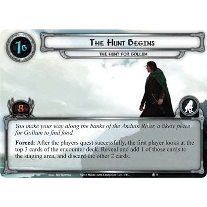 The Hunt for Gollum is the first Adventure Pack in the Shadows of Mirkwood expansion cycle for the Lord of the Rings: The Card Game. Gollum has carelessly left a trail of Clues in his wake, and Gandalf has commanded you and your companions to follow them and discover where the creature has Disappeared to. But be careful, false leads could guide your party in circles, forcing you to begin your hunt anew.