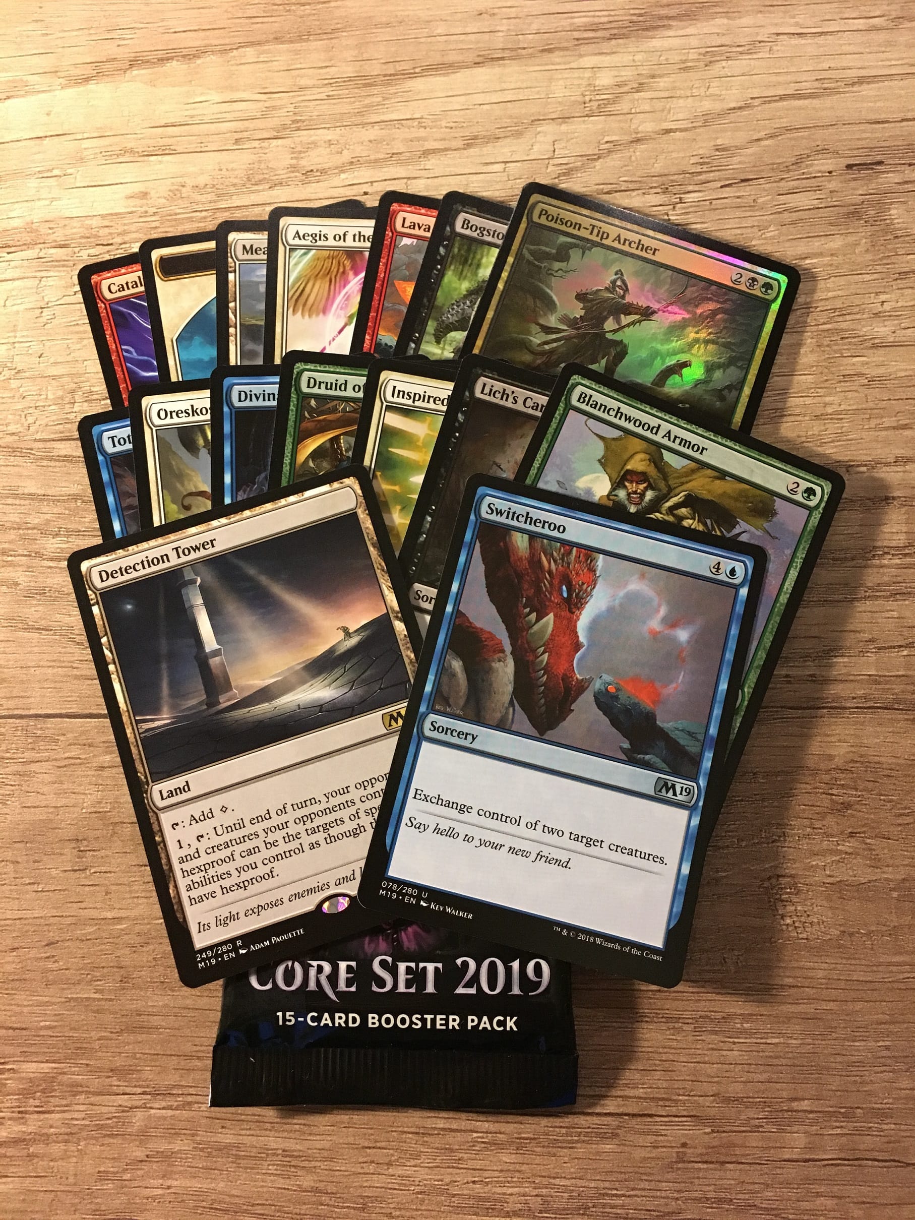 Každý booster obsahuje 15 náhodne namiešaných kariet z edície Core 2019.