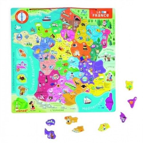 Magnetická mapa Francúzsko obsahuje 94 drevených dielikov puzzle, z ktorých každý reprezentuje určitý región a pokrýva ho obrázok charakterizujúce dané miesto (stavby, pamiatky, zvieratá a rastliny danej oblasti).