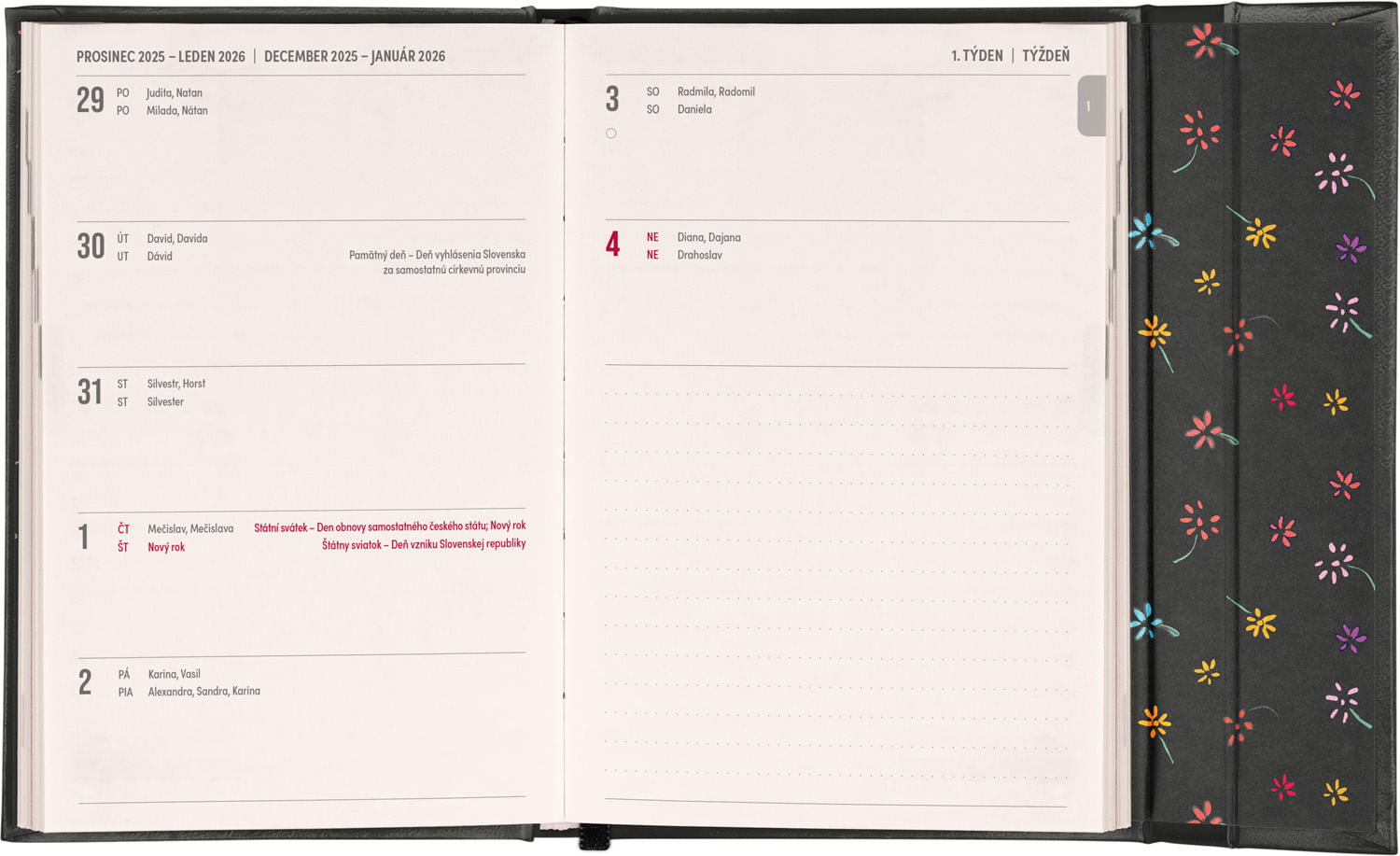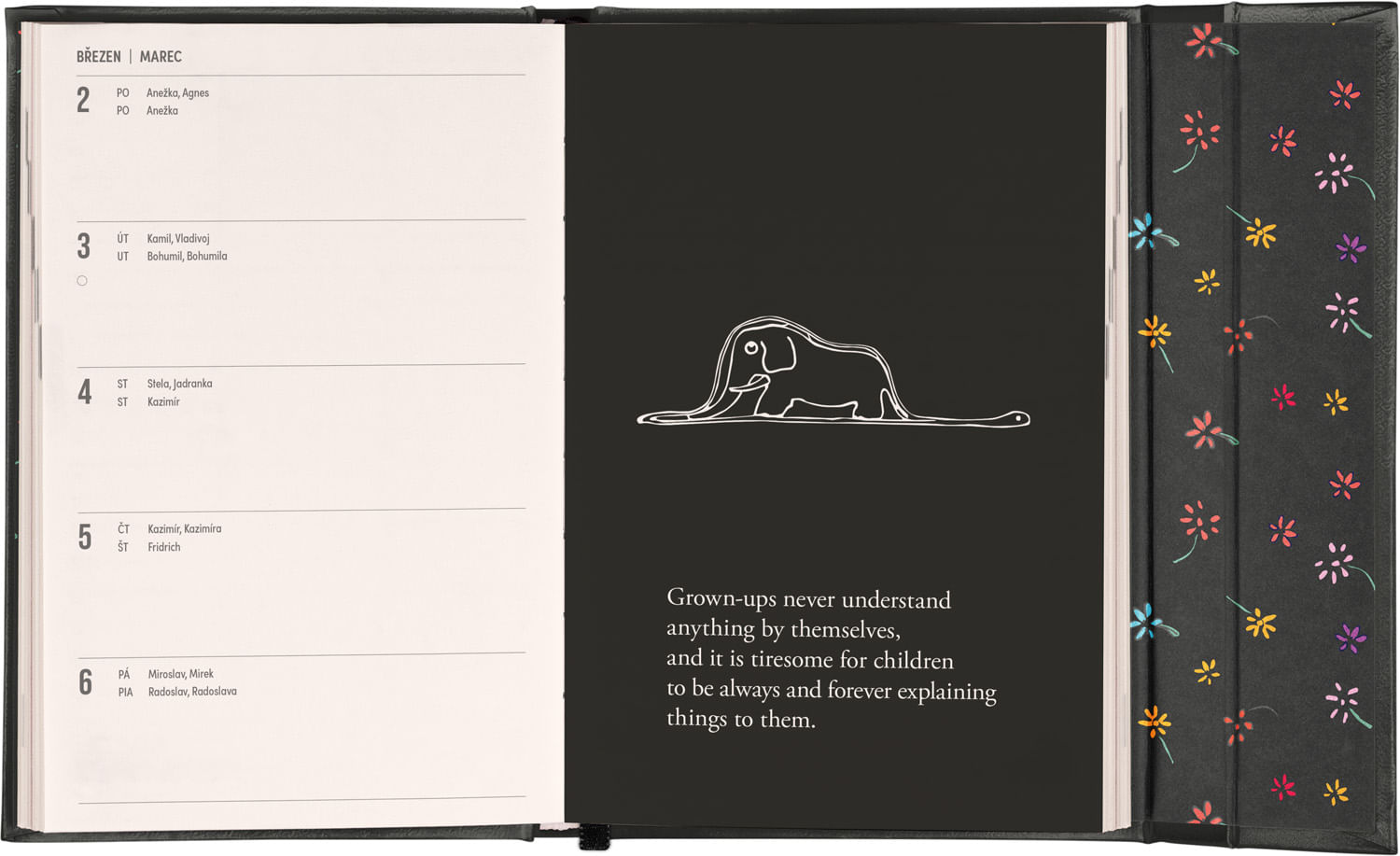 Diár je vybavený českým a slovenským kalendáriom, vrátane sviatkov a menín. Vďaka tomu sa hodí pre každého, kto chce mať dokonalý prehľad a zároveň ocenia štýlový doplnok s obľúbeným motívom.