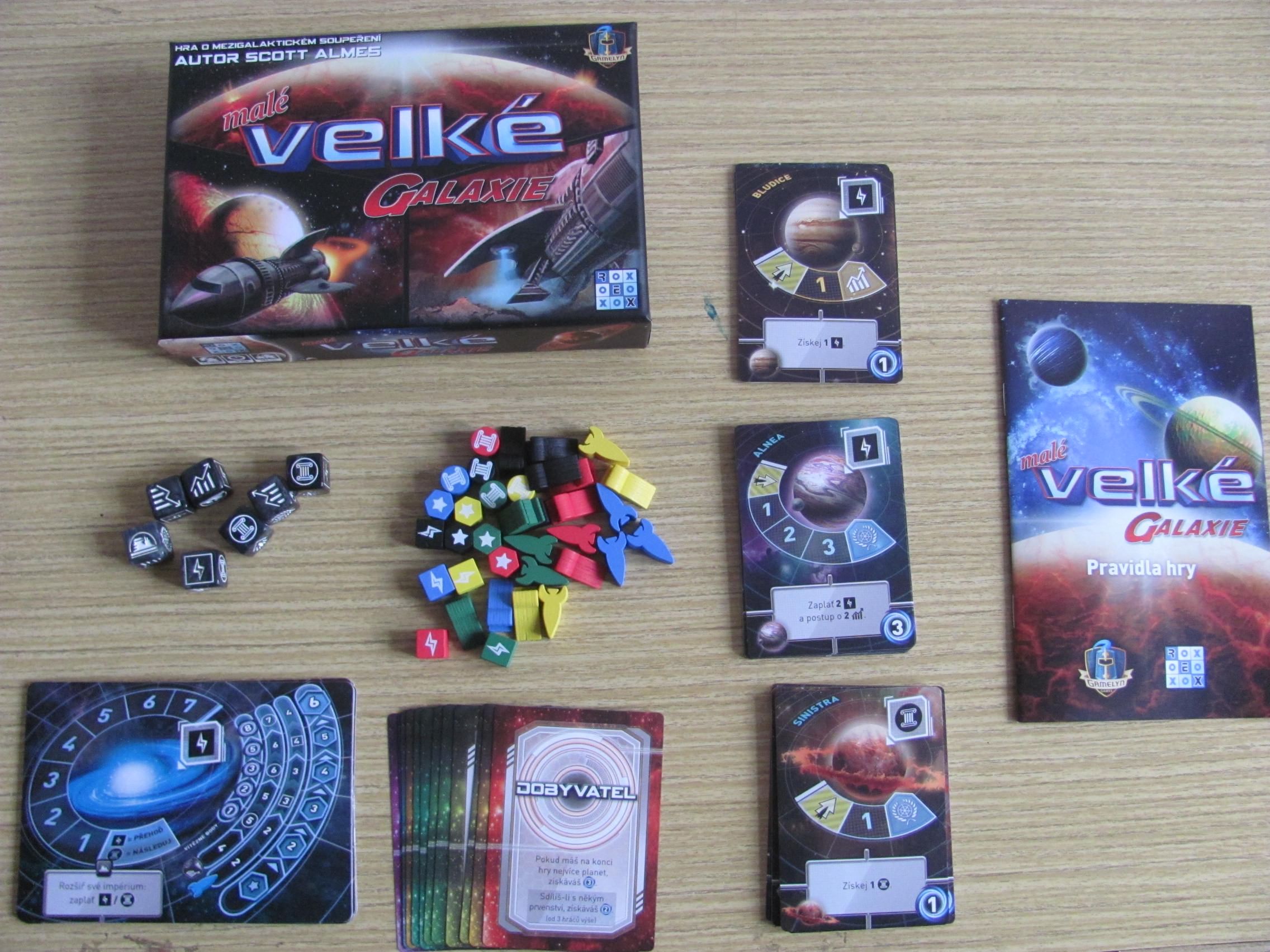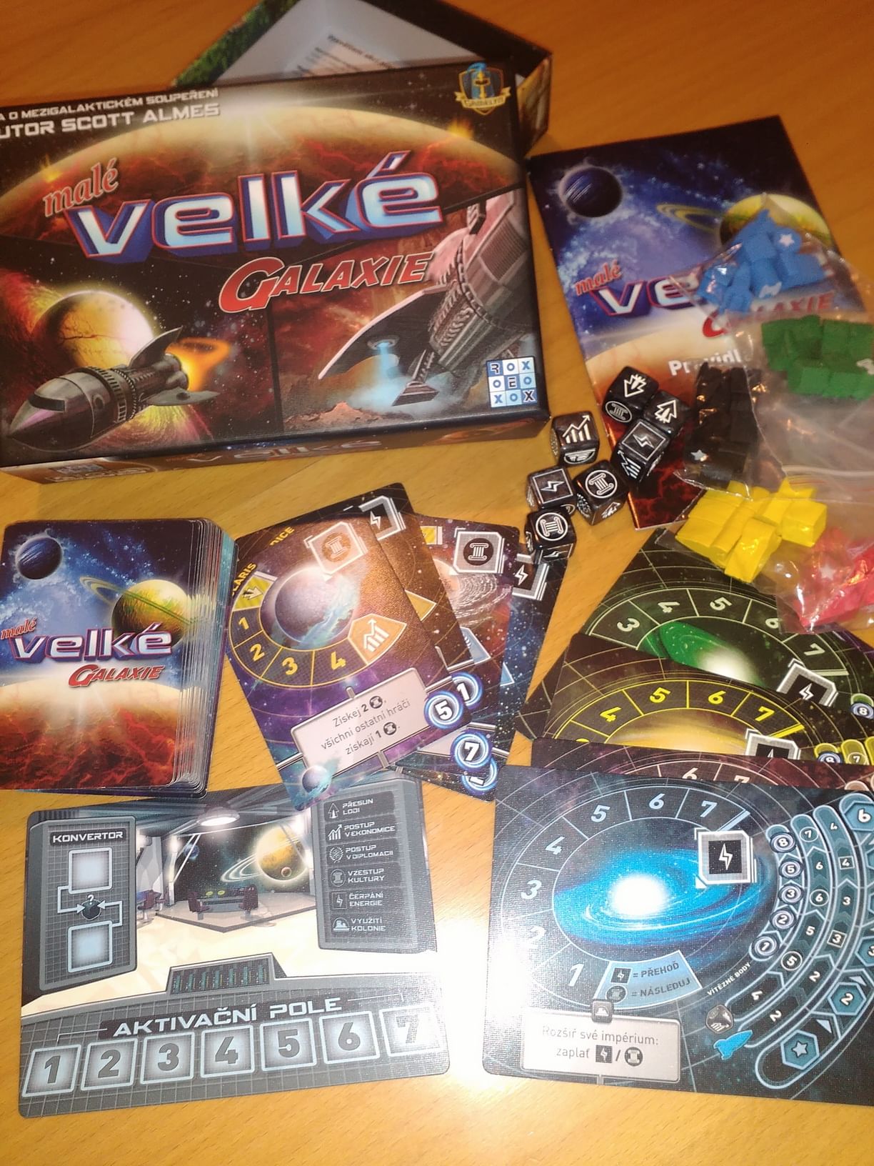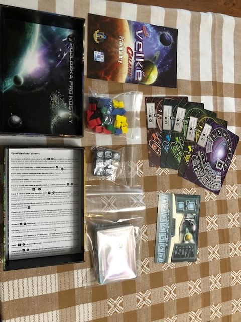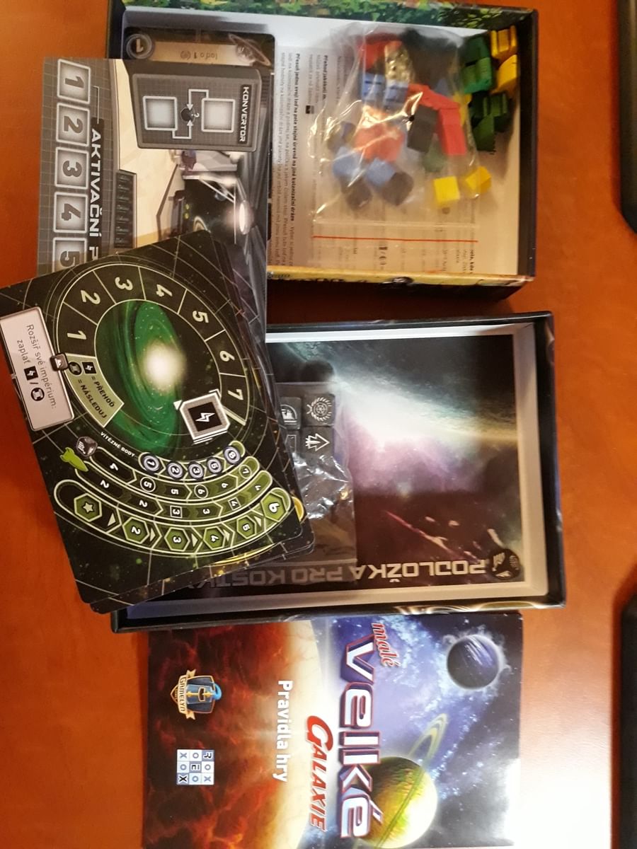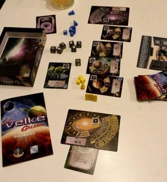 Je toto hodnotenie prínosné? ÁNOHra má hezké a kvalitní komponenty, perfektní je i víko krabičky, které slouží jako podložka pro házení kostkami. Jediné mínus jsou poměrně malé karty galaxií pro jednotlivé hráče - těch pár centimetrů by se do krabičky ještě vešlo - ale to je jen maličkost.