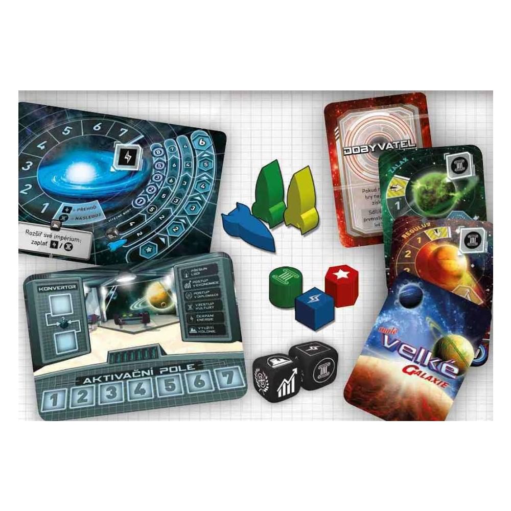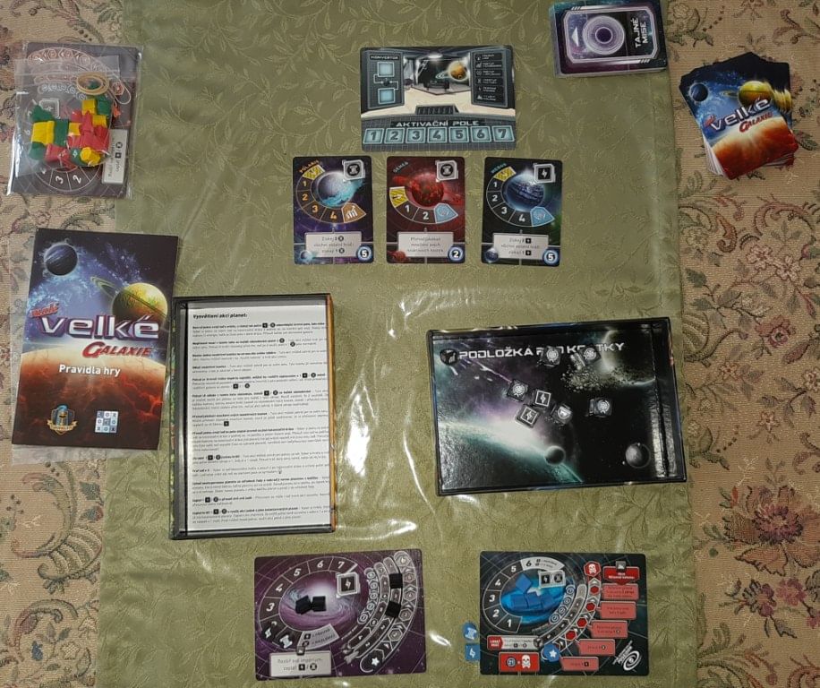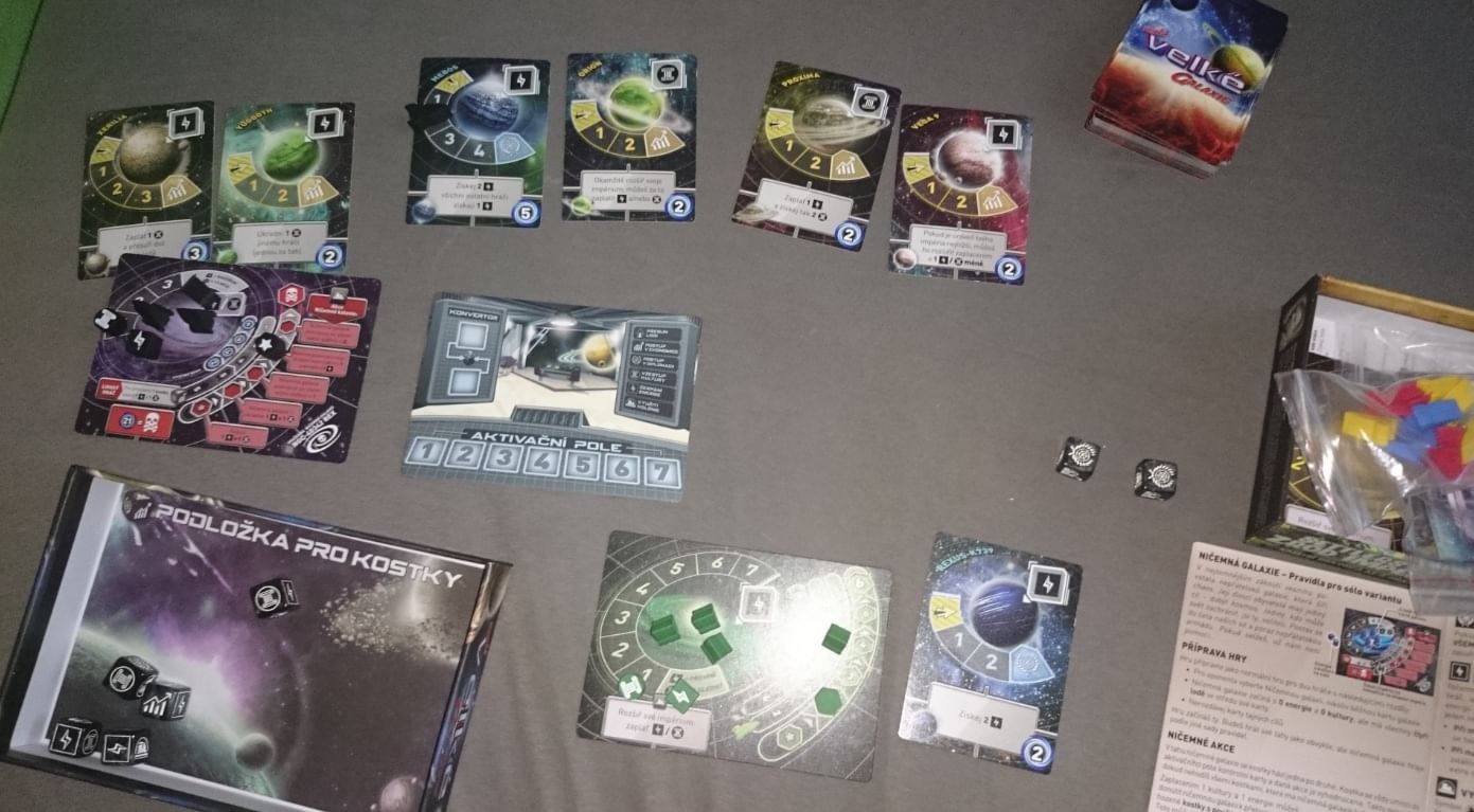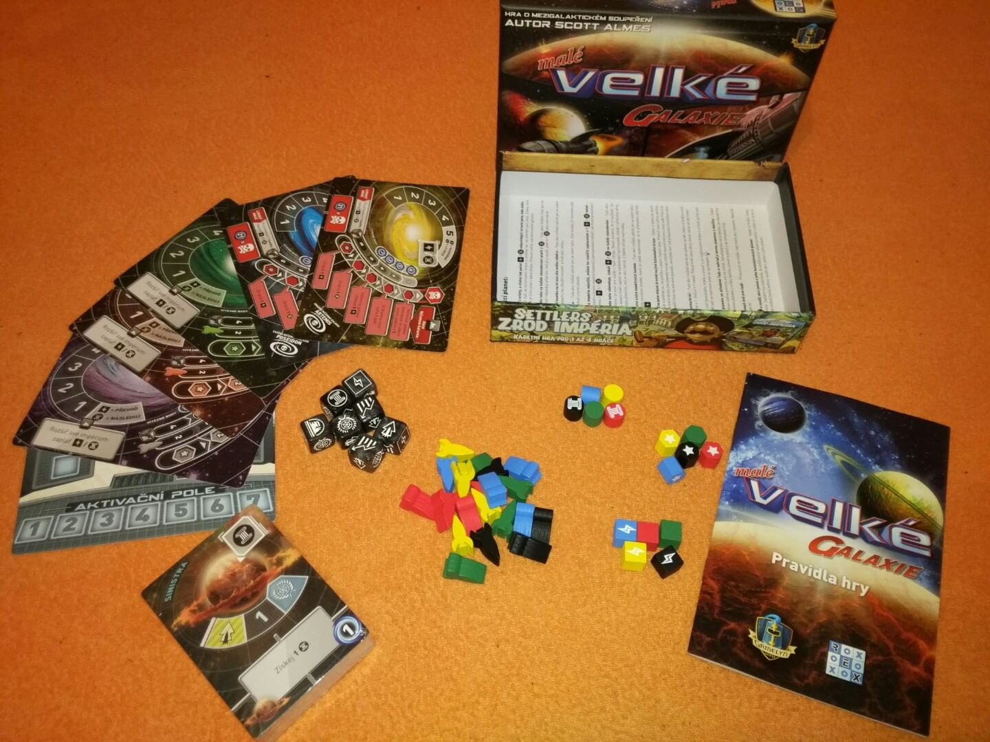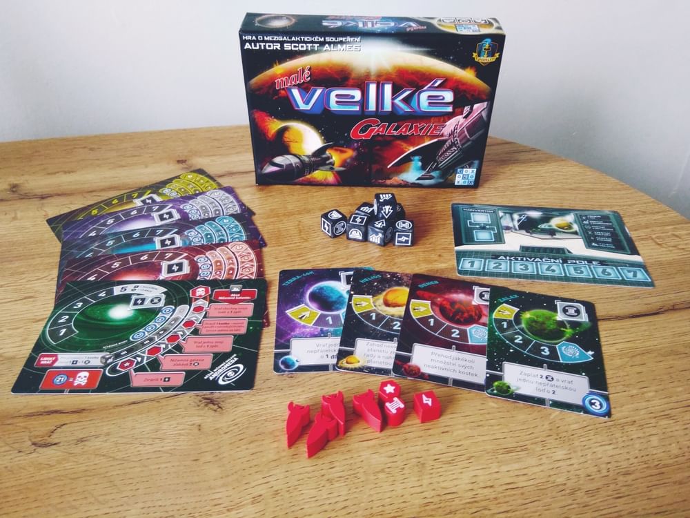Je toto hodnotenie prínosné? ÁNOHra má hezké a kvalitní komponenty, perfektní je i víko krabičky, které slouží jako podložka pro házení kostkami. Jediné mínus jsou poměrně malé karty galaxií pro jednotlivé hráče - těch pár centimetrů by se do krabičky ještě vešlo - ale to je jen maličkost.