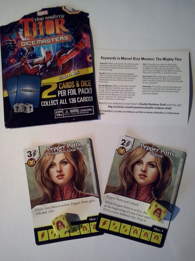 Další z edicí hry Dice Masters ze světa Marvelu. Balení boosteru je stále stejně nedomyšlené, kartičky mají tendenci se různě ohýbat. Hned v prvním jsem měl dvakrát Pepper Pots, tak doufám, že ji najdu ještě aspoň párkrát. :)