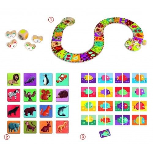 Balenie obsahuje kartónové pexeso so zvieratkami z celého sveta, kartovú hru Čierny Peter v podobe rybky Piraňa a zábavnú spoločenskú hru Kuriatka, na ktorej začiatku si musí dieťa zložiť hrací plán z 10 kúskov puzzle. Cieľom tejto hry je ako prvý prejsť hrací plán a dostať sa na jeho koniec - teda na poslednú políčko.